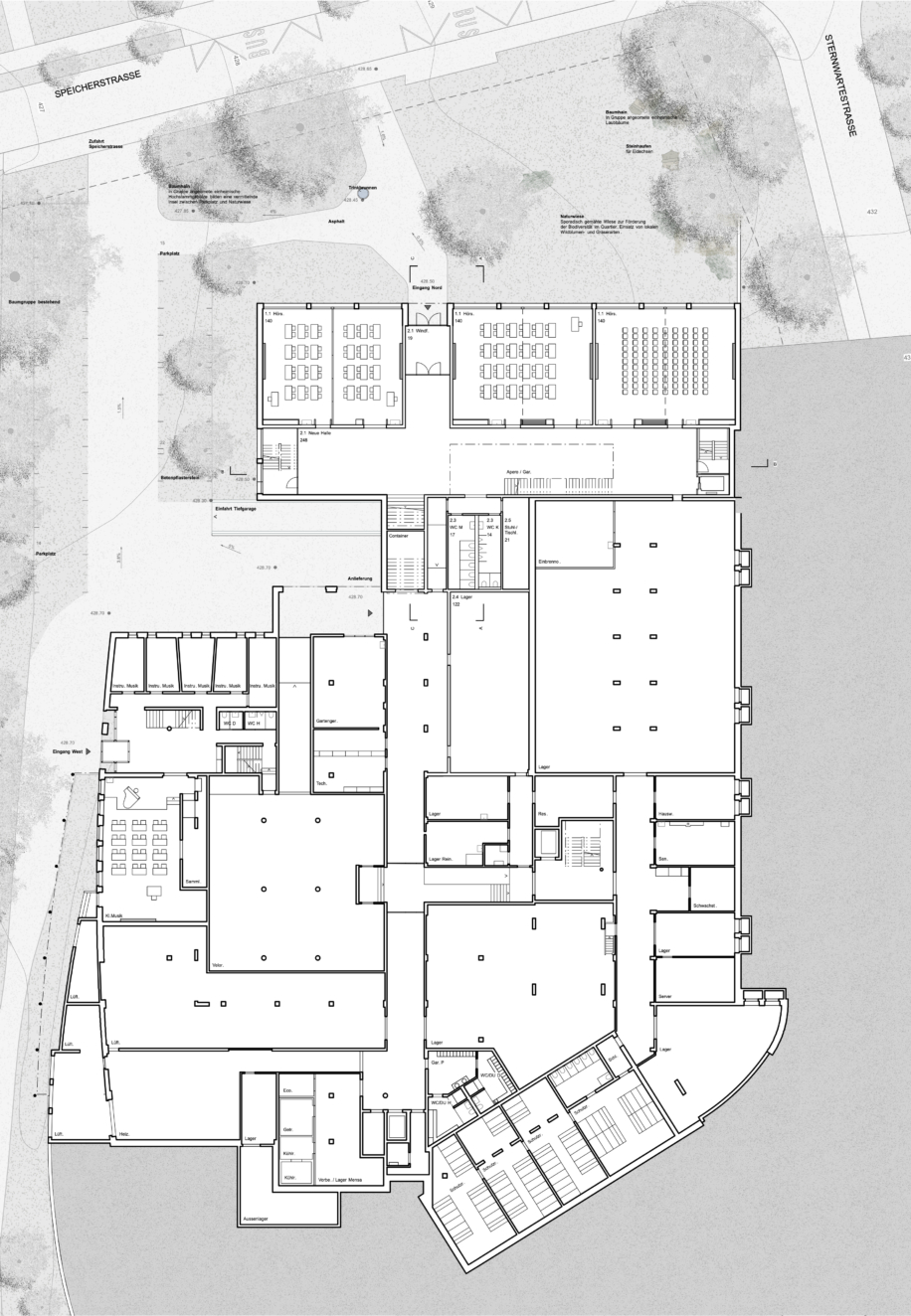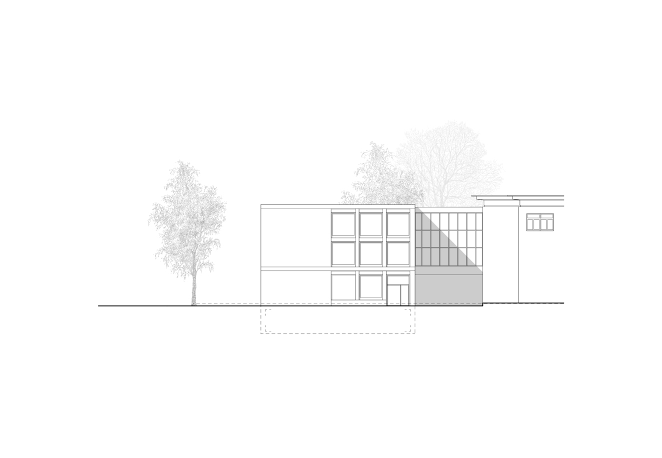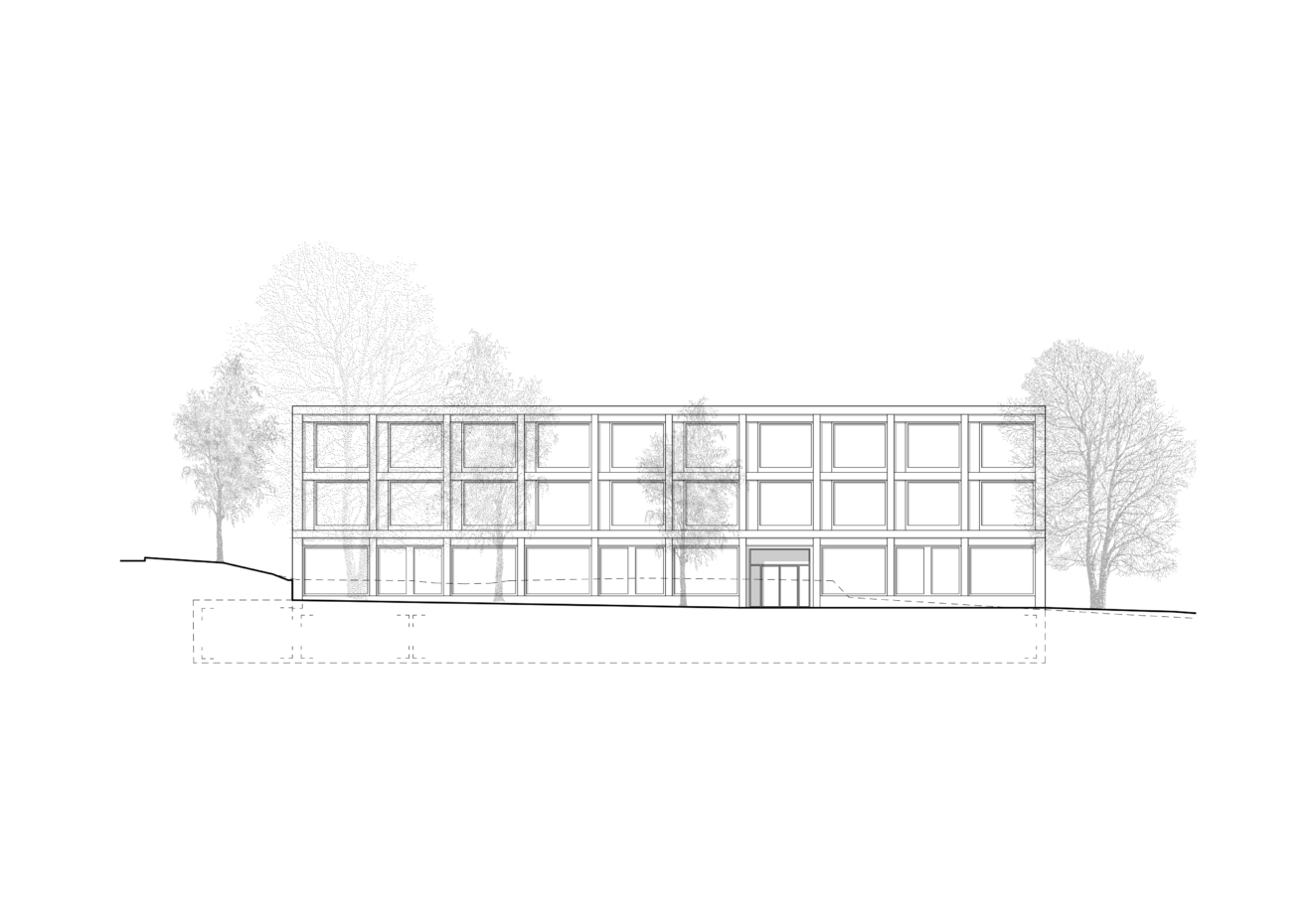 Der Neubau schliesst das bestehende Schulgebäude 2 zur Speicherstrasse ab. Das 3-geschossige Gebäude wird um 90 Grad abgedreht und direkt an den Bestand gesetzt. Es übernimmt die orthogonale Ausrichtung des bestehenden Schulgebäudes 2 und verzichtet auf eine Ausrichtung am Strassenraum. Es setzt sich damit deutlich von der kleinteiligen Villenbebauung im Quartier ab. Mit der Setzung des Neubaus direkt an den Bestand entsteht ein grosszügiger Grünraum zwischen Schulgebäude und Strassenraum. Dieser Grünraum umgibt die Schule und erzeugt einen Filter zum bestehenden Wohnquartier, welcher zwischen den unterschiedlichen Körnungen vermittelt. Der Hauptzugang zum Erweiterungsbau erfolgt von der Speicherstrasse her. Die 3-geschossige Hauptfassade mit dem Eingang Nord gibt dem Schulgebäude 2 eine Adresse. Die Schule erhält damit erstmals ein Gesicht zum öffentlichen Strassenraum.