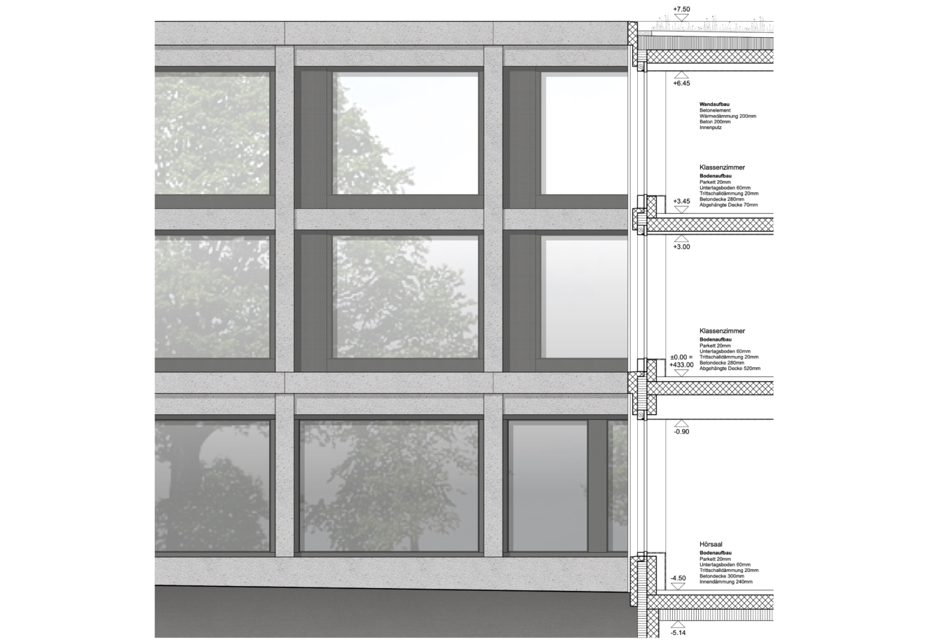 Auf betrieblicher Ebene fügt sich das Projekt in die bestehende Struktur ein und spinnt sie weiter. Im Gebäudeinnern kommt dies zum Ausdruck, indem die bestehende, gelochte Wandscheibe mit dem dazugehörigen Erschliessungskorridor im Neubauprojekt weitergezogen wird. Im Bereich der Fassade setzt sich das Neubauprojekt jedoch deutlich vom Bestand ab. Bei der Hauptfassade zur Speicherstrasse werden grosse Fensterflächen von vorfabrizierten, sandgestrahlten Betonelementen gefasst. Das Sockelgeschoss wird dabei leicht von den beiden oberen Geschossen abgesetzt. Die regelmässige Struktur über drei Geschosse verleiht der Fassade Ruhe und Eleganz. Das Schulgebäude 2 erhält zur Speicherstrasse ein Gesicht mit einer klaren Adressbildung. Das Fassadenkonzept wird auch an den beiden Stirnseiten mit leichten Variationen weitergeführt. Der Erweiterungsbau erhält so eine einheitliche Gebäudehülle, die sich in ihrer Materialität und Tektonik eindeutig vom Bestand absetzt.
