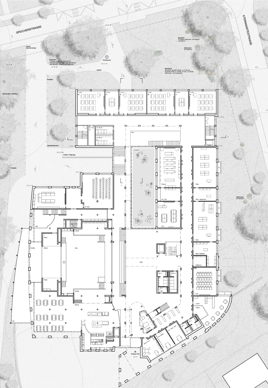 Der bestehende Grünraum entlang der Sternwartestrasse wird um das Neubauprojekt bis zum Hauptzugang Speicherstrasse weitergezogen und mit zusätzlichen Gehölzen verdichtet. Einheimische Bäume und eine Wildblumenwiese sorgen für einen ökologisch wertvollen Aussenraum, der auch als Filter zwischen Schulanlage und Wohnbauten dient. Steinhaufen für Eidechsen tragen zusätzlich zur Biodiversität bei. Im westlichen Teil des Perimeters befinden sich die Besucherparkplätze und die Anlieferung. Für das Atrium wird ein ca. 50cm tiefes Wasserbecken vorgeschlagen, das mit Seerosen bepflanzt wird, zum Beispiel mit der Sorte ‘Little Sue’. Es wird damit zu einem attraktiven Bezugspunkt und bietet einen schönen Ausblick aus den Korridoren.