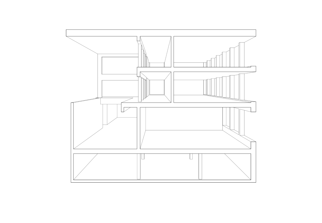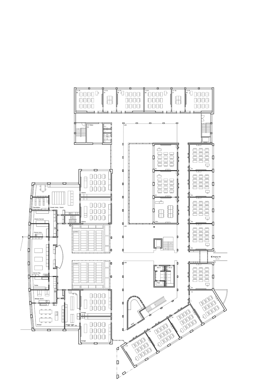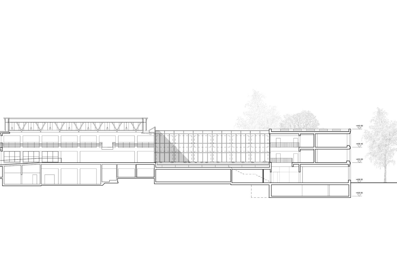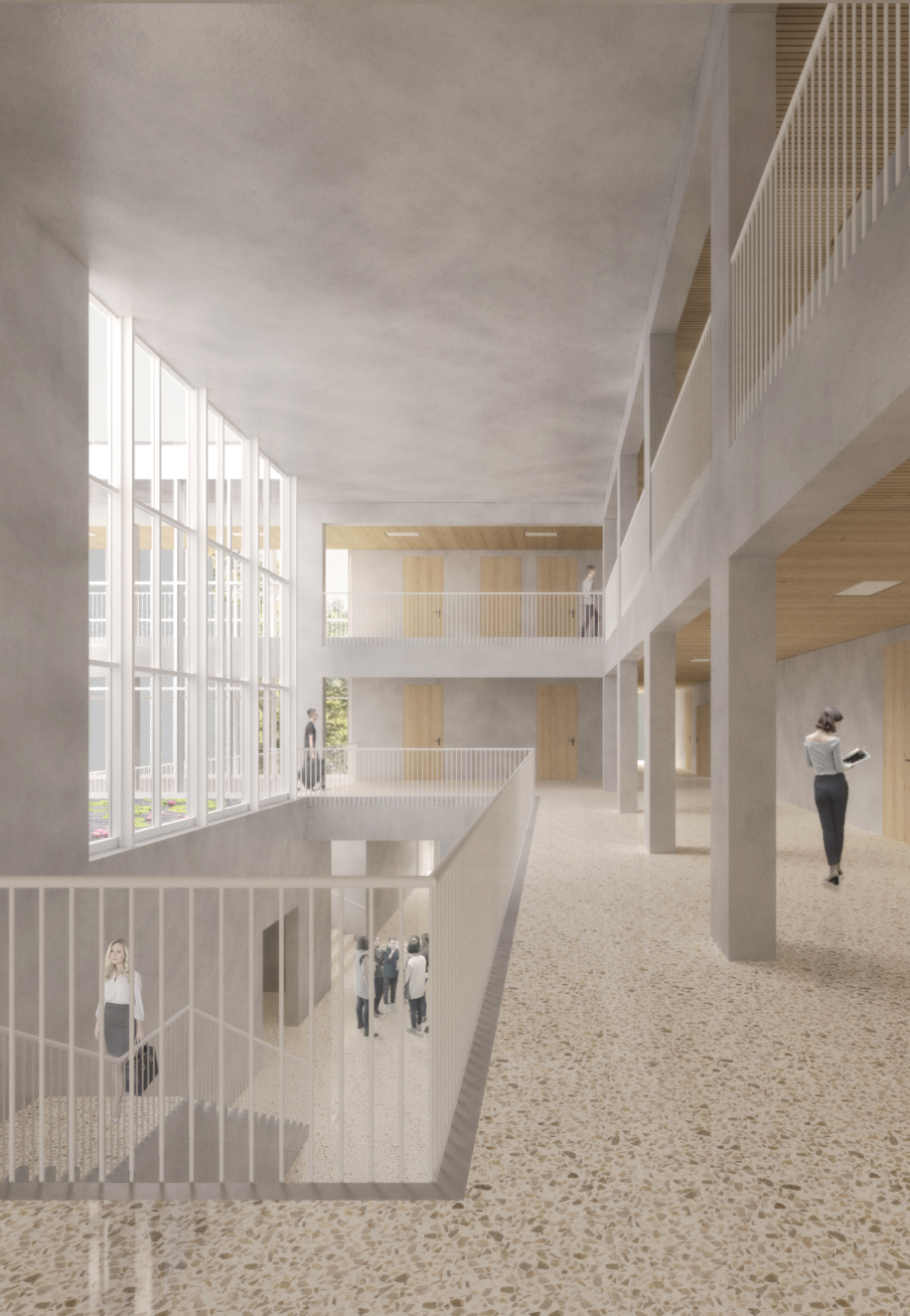 Vom Eingang Nord her wird man in die querliegende Halle geführt, über die man Zugang zu den drei grossen Auditorien im Sockelgeschoss erhält. In der geräumigen Halle ist ausreichend Platz vorhanden, um Garderobe und Ausschankmöglichkeiten für Veranstaltungen unterzubringen. Eine WC Anlage sowie ein Tisch- und Stuhllager ist diesem Raum ebenfalls angegliedert. Von der neuen Halle führen 2 Treppenanlagen in die beiden oberen Geschosse, wo jeweils 4 Klassenzimmer mit dazwischen liegenden Gruppenräumen und weiteren Nebenräumen untergebracht sind. Mit der Verlängerung der bestehenden, zentralen Erschliessungsachse werden die neuen Schulräume optimal an den Bestand angebunden. Im Neubau wird der 2-geschossige Luftraum aus dem Bestand weitergeführt und schafft damit ein zentrales Atrium. Dies ermöglicht eine gute Orientierung in der Anlage und gewährleistet die Belichtung für den Vorbereich der Auditorien im Sockelgeschoss des Neubaus.