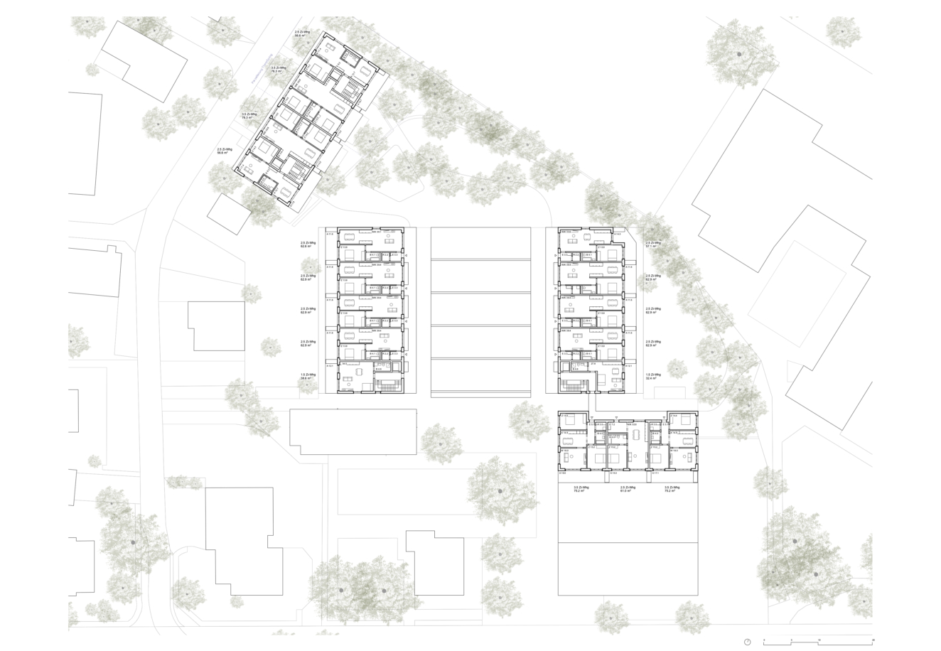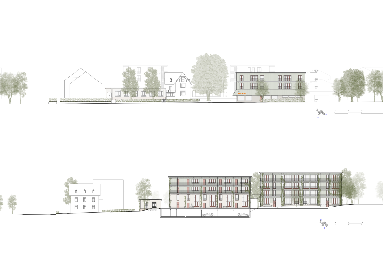 Zur Bahnhofstrasse schliesst ein dreigeschossiger Bau mit der Migros im Erdgeschoss den Raum. Auf der Westseite vermittelt ein Mehrfamilienhaus zum bestehenden Wohnquartier. Die grösste Dichte entsteht im Zentrum des Grundstücks, während die Bebauungsdichte an den Rändern des Grundstücks abnimmt.