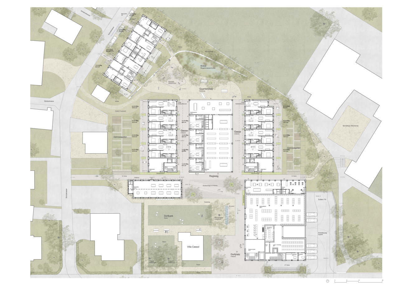 Die Bibliotheksnutzung im Herzen des Areals lässt auf der strassenzugewandten Seite einen platzartigen Freiraum entstehen, den Dorfplatz, der dem Areal als Zugang und Adresse, sowie der Migros als Vorplatz dient. Im Zusammenspiel mit dem zum kleinen Dorfpark aufgewerteten Garten der Villa Cassol und dem mächtigen bestehenden Kastanienbaum entsteht ein dem Aufenthalt und dem Fussgänger gewidmeter Freiraum mit vielfältigen Aspekten und Nutzungsmöglichkeiten. Zwei neue Bäume gesellen sich mit der Kastanie zu einer Baumreihe und bieten mit einem Sitzelement aus grossen Holzbalken robuste Sitzelemente auf dem «urbanen» Dorfplatz. Mit seinem chaussierten Belag schiebt sich der Dorfpark in den Platz und überlagert diesen. Ein grosszügiges Brunnenbecken bildet – im Ensemble mit der Kastanie – als Scharnier den Mittelpunkt der Schnittfläche. Der Brunnen ist Fortsetzung des klassischen Rasengevierts, auf dem Zutritt ausdrücklich erlaubt ist. Sitzbänke begleiten die Kieswege und laden zum Sitzen in der Sonne, im Schatten oder im Schutz des berankten Sockels des erhaltenen Fabrikgebäudes, in dem ein Hort oder Siedlungslokal unterkommen kann. Eine in Länge und Breite ausgedehnte Stufenanlage spannt sich zwischen diesem Gebäude und dem Neubau mit der Migros auf und überwindet den Höhensprung hinauf zum Wohnschwerpunkt des Areals.