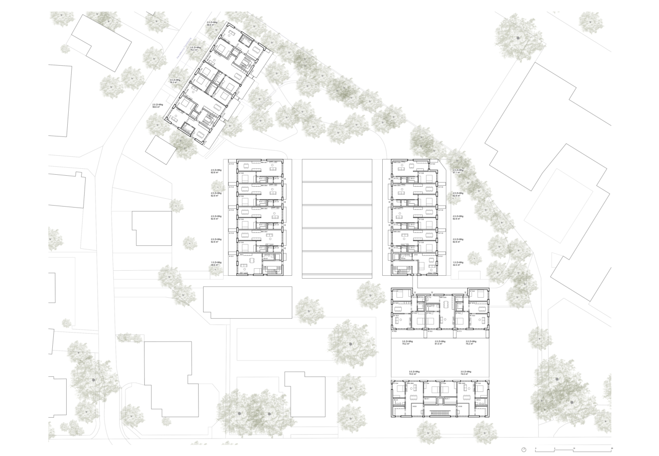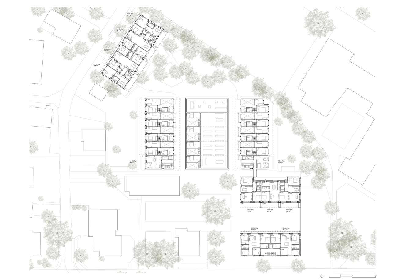 Im Zentrum des Projektvorschlages befindet sich die bestehende, eingeschossige Shedhalle mit den flankierenden Wohnbauten, sie bilden das Herz der Anlage. Mit dem Erhalt des Untergeschosses und einem Teil der Shedhalle wird die Setzung der Fabrikbauten auf dem Grundstück aufgenommen und zum Ausgangpunkt der Weiterentwicklung gemacht. Mit der Anordnung der zwei Wohngebäuden wird eine räumliche Dichte erreicht, die an anderer Stelle grosszügige Freiräume ermöglichen.