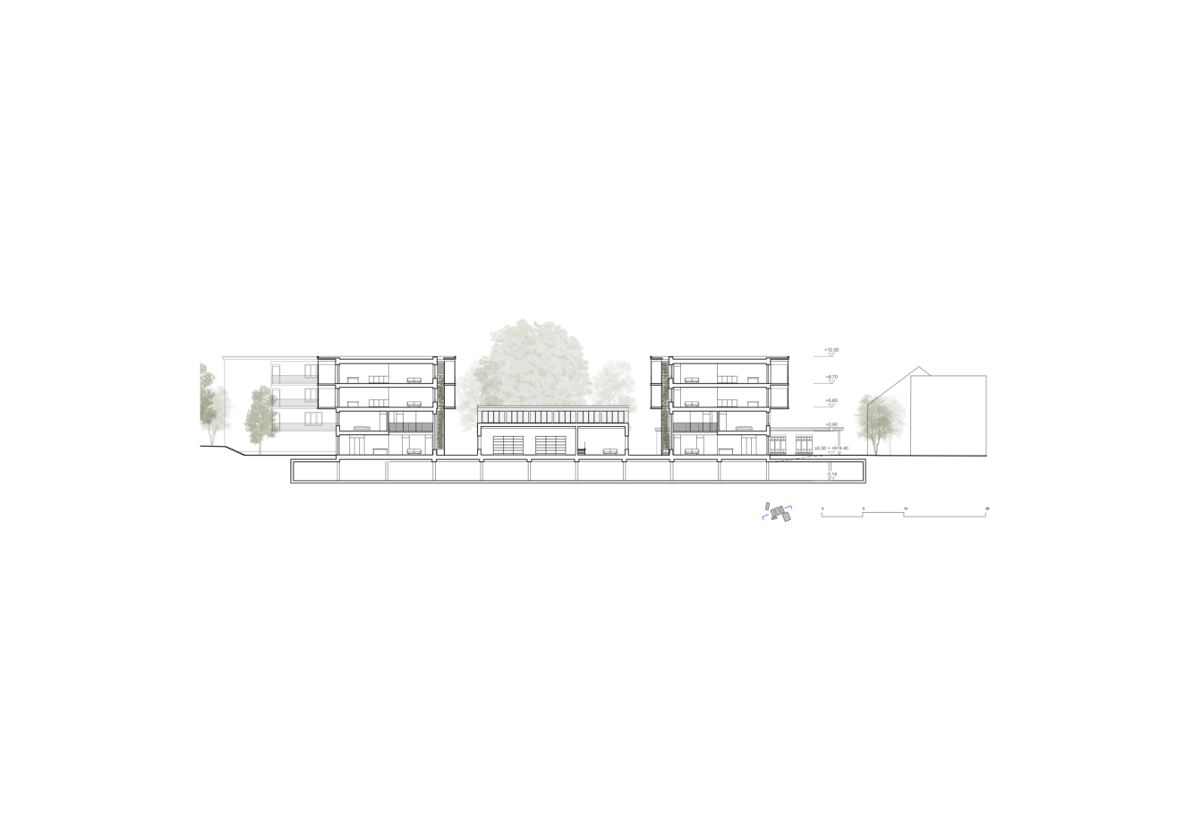 Zur Schulstrasse wird ein 4-geschossiges Wohngebäude gesetzt, welches zur zentralen Shedhalle einen grosszügigen, dreieckigen Aussenraum aufspannt. Hier befindet sich der Quartierplatz, gesäumt von einer kräftigen, natürlichen Bepflanzung. Das Siedlungslokal schliesst die Shedhalle ab und orientiert sich auf diesen Platz.