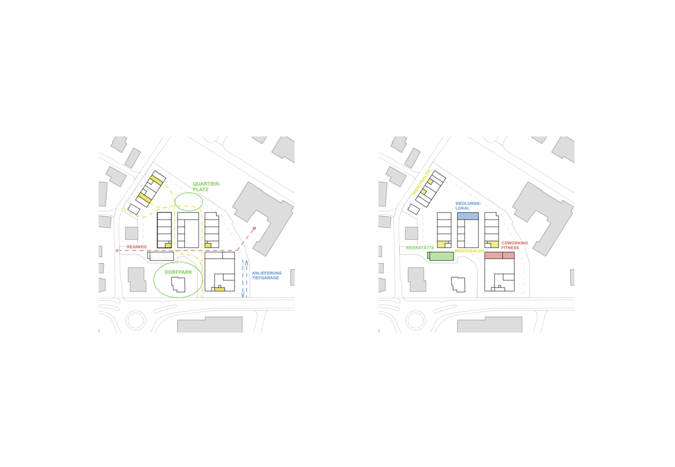 Die in der ehemaligen Scheddachhalle untergebrachte Bibliothek wird beidseitig von Wohnhäusern flankiert. Zwischenliegende Fugen erschliessen als Wohngasse die Hauszugänge und Ateliers und führen zum Quartiersplatz im Norden. Jede EG-Wohnungen erhält einen Vorbereich in der Gasse, der durch Rankpflanzen leicht vom Nachbarn separiert wird. In Ost-West Richtung verläuft vor der Bibliothek die Wegachse zwischen Schulstrasse und Primarschule und ergänzt so das öffentliche Wegenetz.