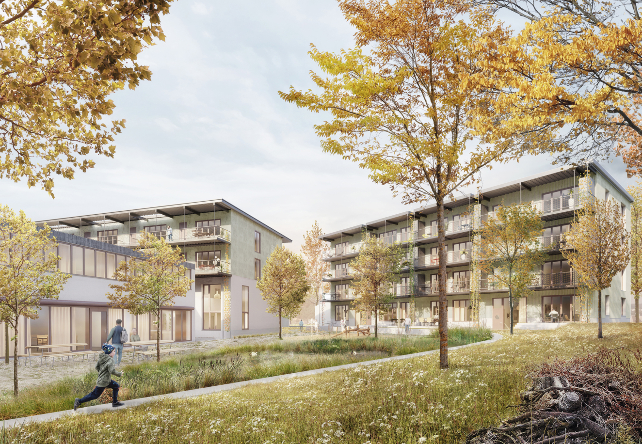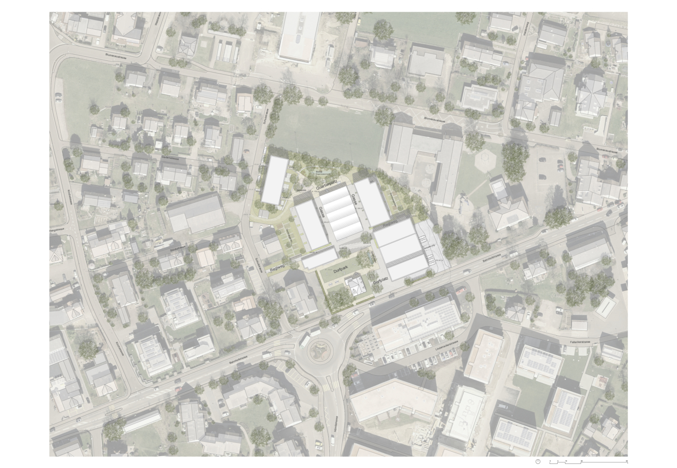 Die Wandlung des ehemaligen Fabrikareals in einen neuen Wohnschwerpunkt mit öffentlichen Funktionen und Food-Retailer (Migros) ermöglicht einerseits die Entwicklung eines Ortszentrums für das gesamte Dorf, andererseits die Entsiegelung und den Einzug der Natur als lebenswertes Zuhause für die Bewohner.