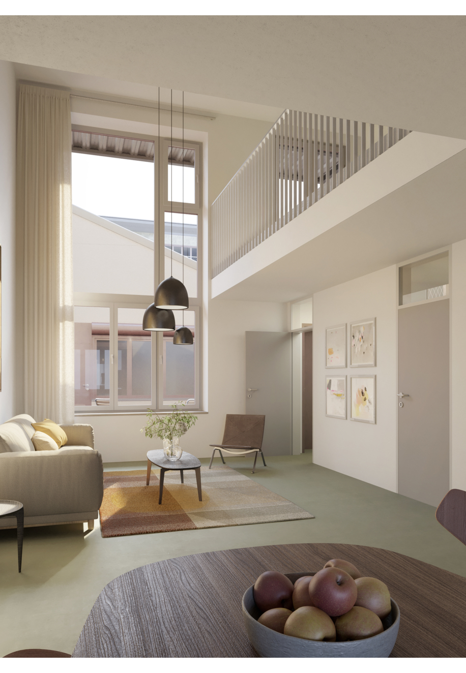 Auf der Westseite der erhaltenen Shedhalle wird ein 4-geschossiges Wohnhaus auf das bestehende Untergeschoss gesetzt. Die statische Struktur orientiert sich am vorgefundenen Stützenraster. Das Wohngebäude wird auf die Ostseite der Shedhalle gespiegelt. Alle drei Bauten zusammen bilden das Herz der Anlage.