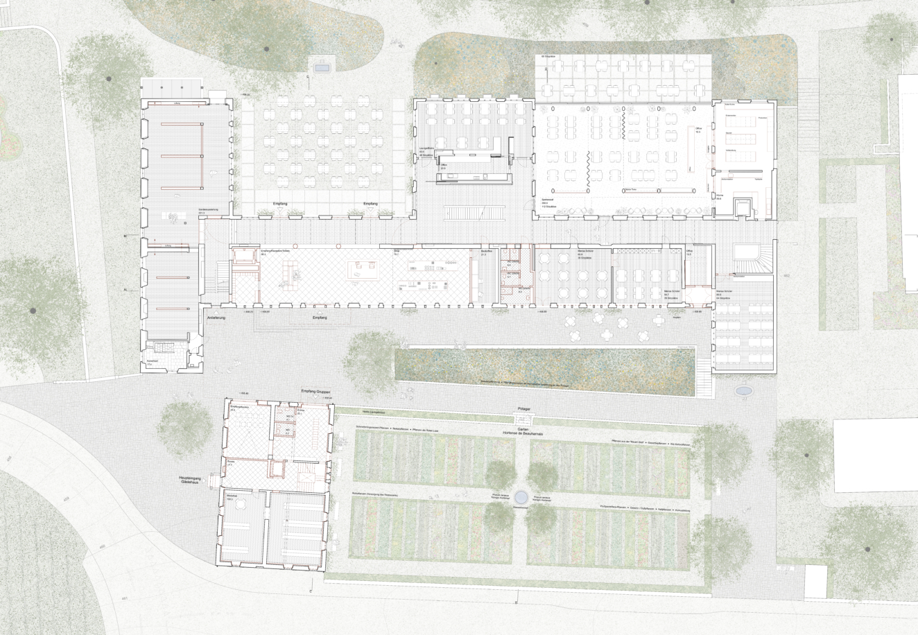 Prinzenflügel: Messing wird als neues Material in die bestehende Materialwelt eingeführt und verbindet die Elemente im neugestalteten Empfangsbereich. Bei der Fassade werden die bestehenden Öffnungen weitgehend erhalten und da wo nötig durch neue Gewände ergänzt. Das geschwungene Vordach über dem südlichen Haupteingang bezieht sich in seiner Form auf die beste- henden, darunterliegenden Gewände und stärkt damit die vorgefundenen Fassadengestaltung. Farblich soll das Hauptgebäude in einem hellen Ocker gestrichen werden.