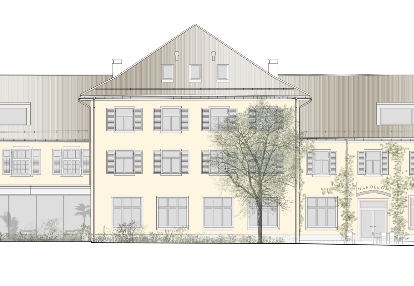 Der bestehende Zugang zum Treppenhaus beim Prinzenflügel dient der Anlieferung und wird mit einem Vordach ausgestattet. Die zusätzlich gef- orderten Lagerräume werden im Untergeschoss unter den südlichen Hof gesetzt. Minimale bauliche Eingriffe unter dem Hauptgebäude und dem Gästehaus erschliessen die neuen Lager- und Technikräume. Gleichzeitig werden damit die beiden Gebäude miteinander unterirdisch verbunden. Auf aufwendige, bauliche Massnahmen unter dem bestehenden Hauptgebäude kann mit diesem Ansatz verzichtet werden. Betriebliche Beeinträchtigungen von Hotellerie und Gastronomie können damit während der Bauzeit auf ein Minimum reduziert werden.