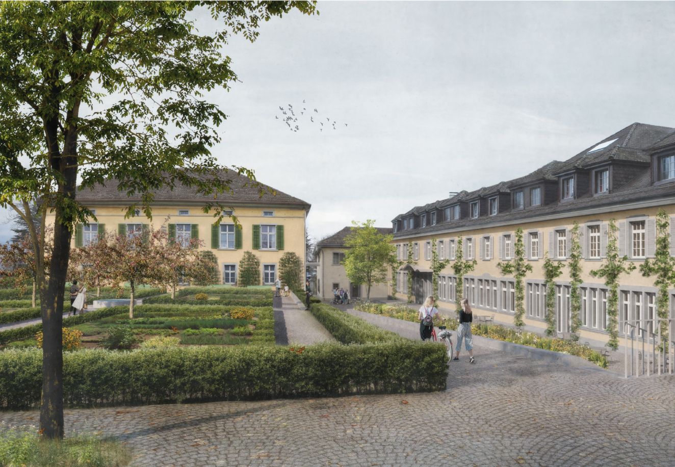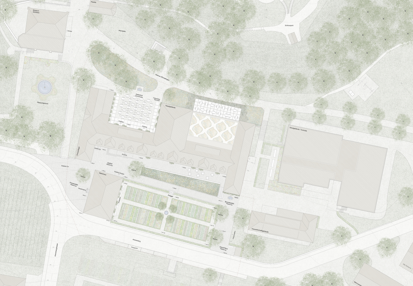 Ein gepflasterter Zugangshof erschliesst den Empfang für Hotel und Museum von der Südseite her. Die Beziehung zwischen Hauptgebäude und Gästehaus wird über den gemeinsamen Hof gestärkt. Die beiden Eingänge zu den Gebäuden werden durch ein geschwungenes Vordach ausgezeichnet und mit einem Baum auf der Ostseite räumlich gefasst. Die Anbindung an die Bussstation wie auch an den westlichen Zugangshof wird verstärkt und attraktiver gestaltet.