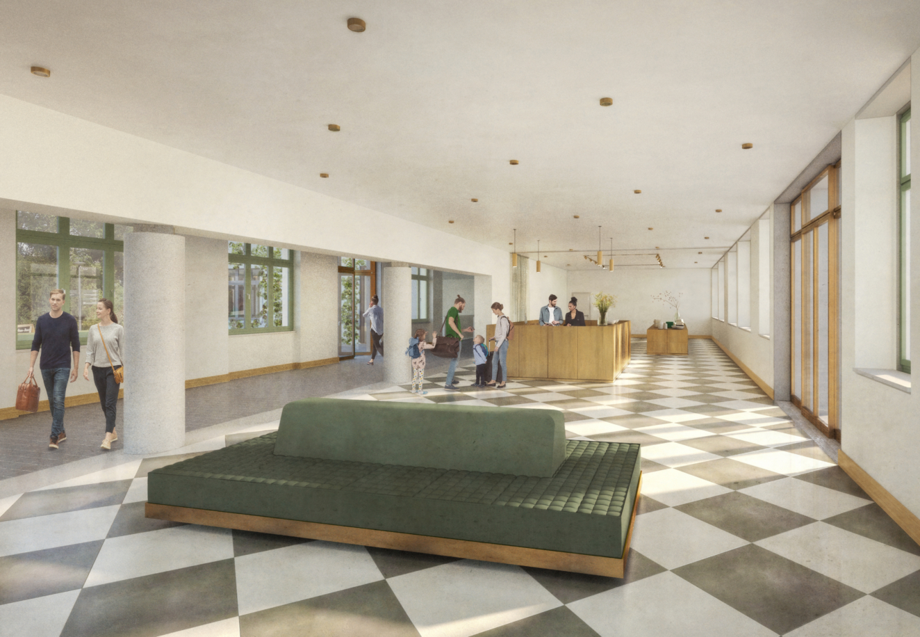 Der Empfang im Erdgeschoss bleibt ebenfalls auf dem heutigen Niveau. Die bestehenden Fenstergewände können damit als identitätsstiftendes, wertvolles Element der Südfassade erhalten werden. Ein neuer Lift ver- bindet den Empfang mit den Ausstellungsräumen und den Hotelzimmern in den Obergeschossen.