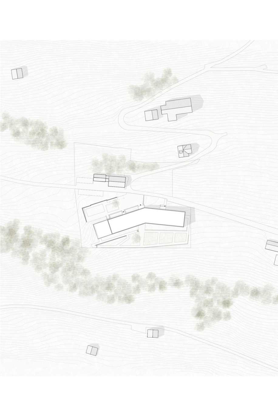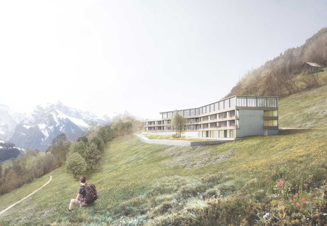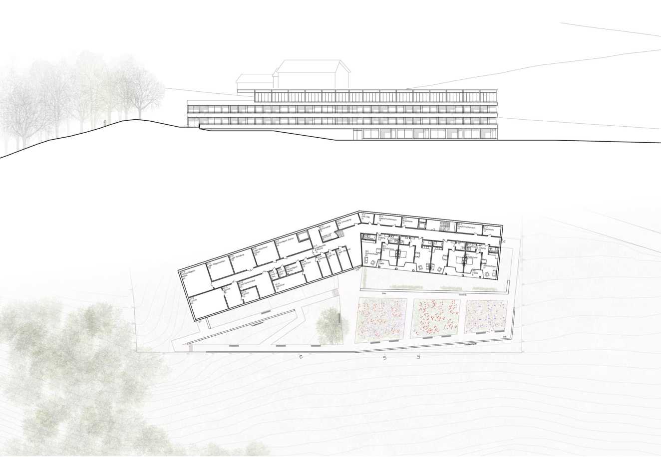 Der Neubau für das Alters- und Pflegeheim Aeschen profitiert von seiner atemberaubenden Lage am Dorfrand von Amden. Landschaftliche Merkmale zeichnen den Ort aus. Hochstamm Baumgruppen gliedern die Weite der Wiesen und bilden naturnahe Lebensräume. Die topografische Auszeichnung im steilen Hang in Form einer Kuppe ist ein idealer Ort für das Altersheim und seinen Garten. Die Distanz zum Dorf wird in Anlehnung an das ehemalige Armenhaus durch eine leichte Drehung kompensiert. Das stumpfwinklige, zweiflüglige Gebäude geniesst einen fantastischen Rundblick auf das Dorf, die Bergkette der Churfirsten samt Walensee und auf die gegenüberliegende Bergkette der Glarneralpen. Der Baukörper wird in den steilen Hang gesetzt und auf Hinterfüllungen verzichtet. Die talseitige Fassade lehnt sich mit der durchgehenden Loggiazone an die Typologie von Sanatorien. Der Baukörper erhält dadurch eine räumliche Tiefe welche die Bewohnerzimmer auf angenehme Art und Weise beschattet.