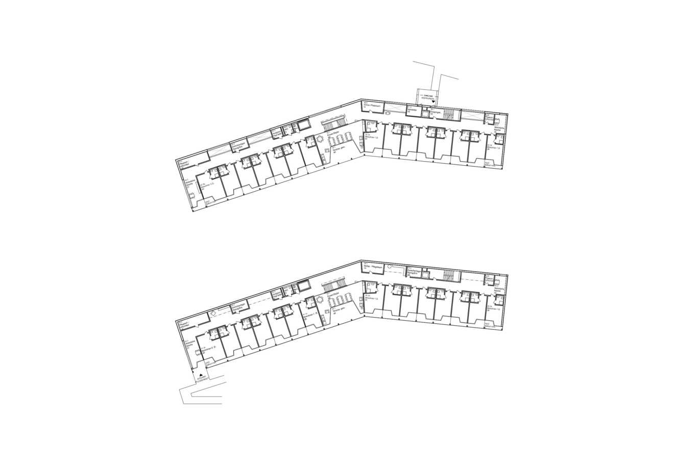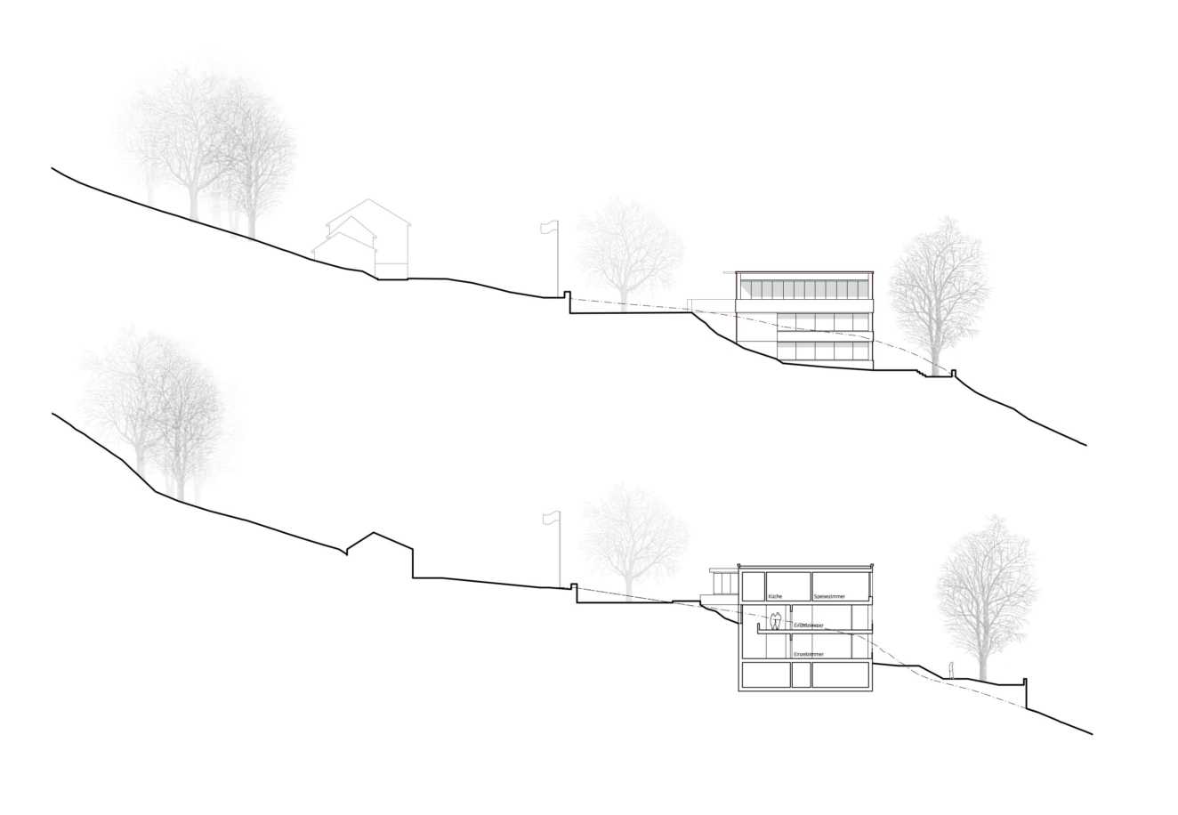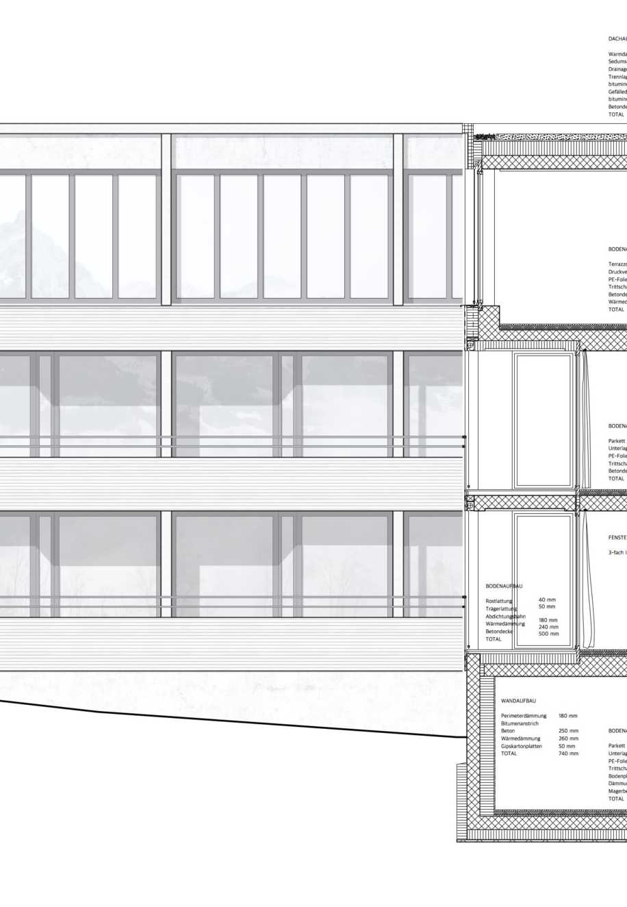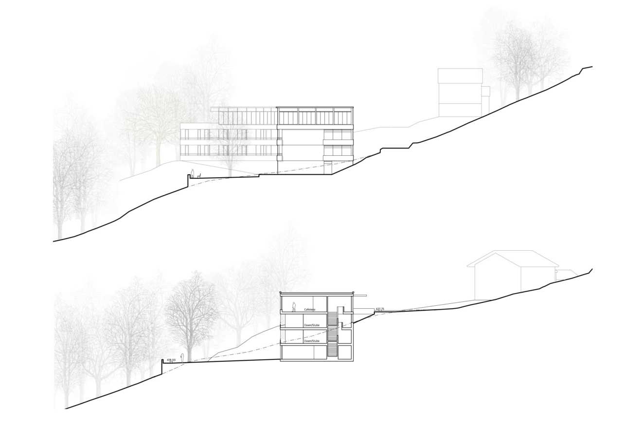 Der Neubau für das Alters- und Pflegeheim Aeschen profitiert von seiner atemberaubenden Lage am Dorfrand von Amden. Landschaftliche Merkmale zeichnen den Ort aus. Hochstamm Baumgruppen gliedern die Weite der Wiesen und bilden naturnahe Lebensräume. Die topografische Auszeichnung im steilen Hang in Form einer Kuppe ist ein idealer Ort für das Altersheim und seinen Garten. Die Distanz zum Dorf wird in Anlehnung an das ehemalige Armenhaus durch eine leichte Drehung kompensiert. Das stumpfwinklige, zweiflüglige Gebäude geniesst einen fantastischen Rundblick auf das Dorf, die Bergkette der Churfirsten samt Walensee und auf die gegenüberliegende Bergkette der Glarneralpen. Der Baukörper wird in den steilen Hang gesetzt und auf Hinterfüllungen verzichtet. Die talseitige Fassade lehnt sich mit der durchgehenden Loggiazone an die Typologie von Sanatorien. Der Baukörper erhält dadurch eine räumliche Tiefe welche die Bewohnerzimmer auf angenehme Art und Weise beschattet.