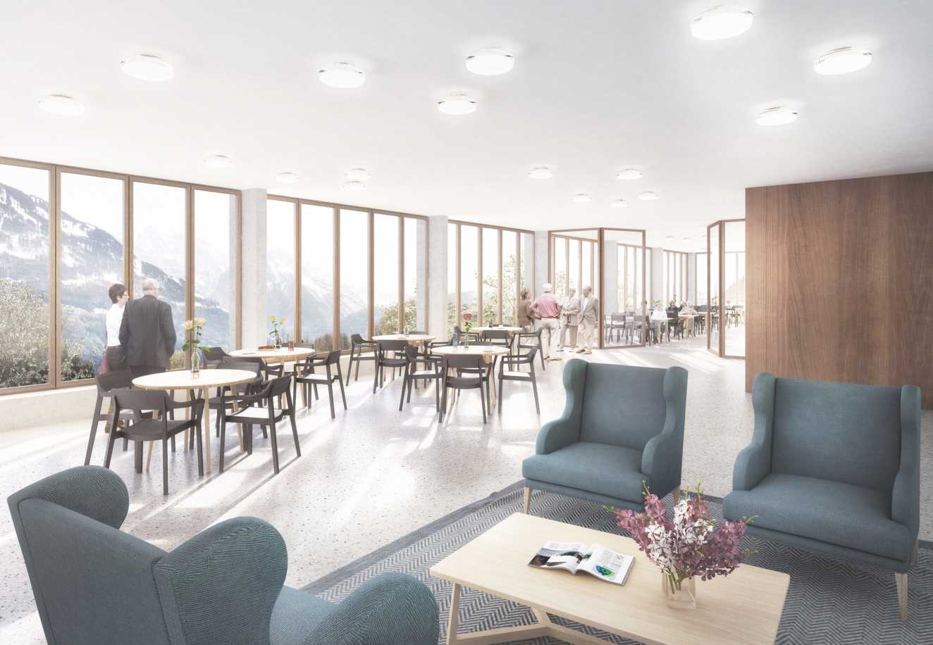 Im Ostflügel liegen der Allzweck- und Sakralraum, sowie die Büroräume für den Heimbetrieb. Die öffentlichen Räume werden mit fugenlosen Terrazzoböden und Holz ausgestaltet.