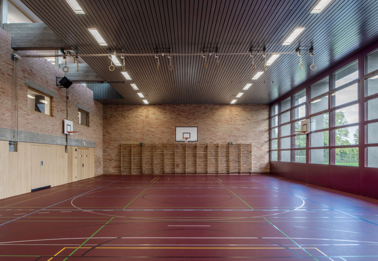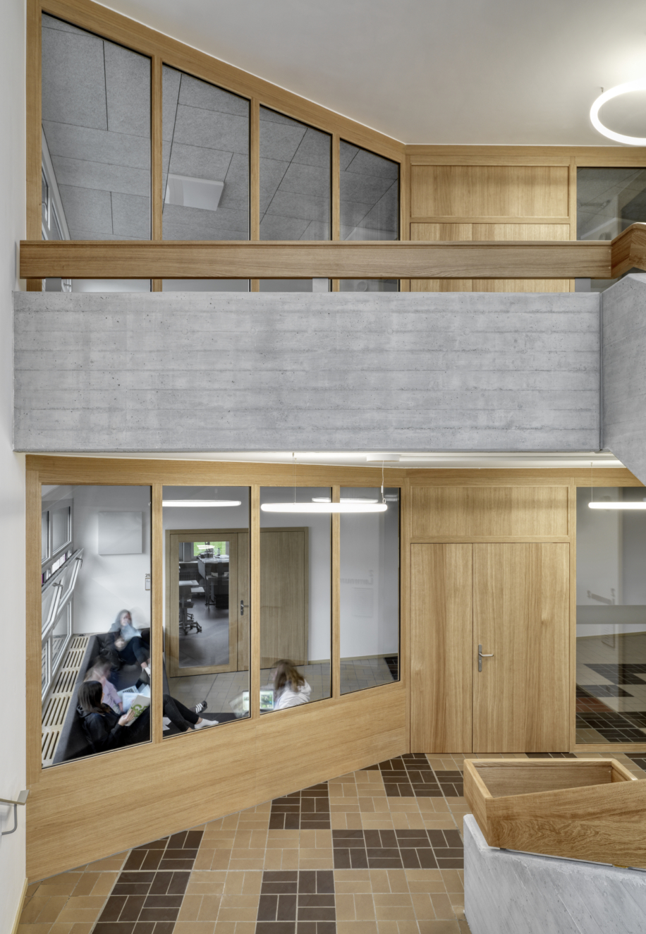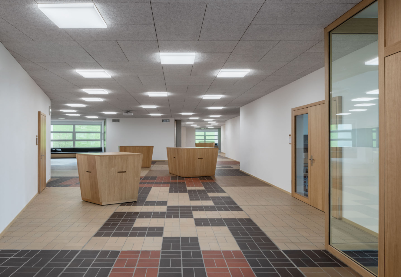 Die fünf Klassenzimmer auf drei Obergeschossen erhalten zweiflüglige Türen mit Glaseinsätzen und weichen die heutige hermetische Beziehung zwischen Klassenzimmer und Gangzone auf – eine fliessende Lernlandschaft entsteht. Sie ist innerhalb der amorphen Raumteiler frei möblierbar und unterstützt moderne Unterrichtsformen.