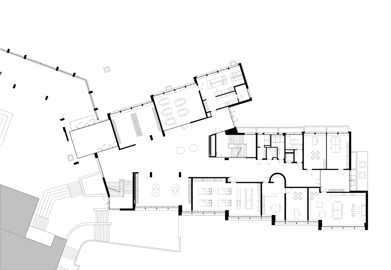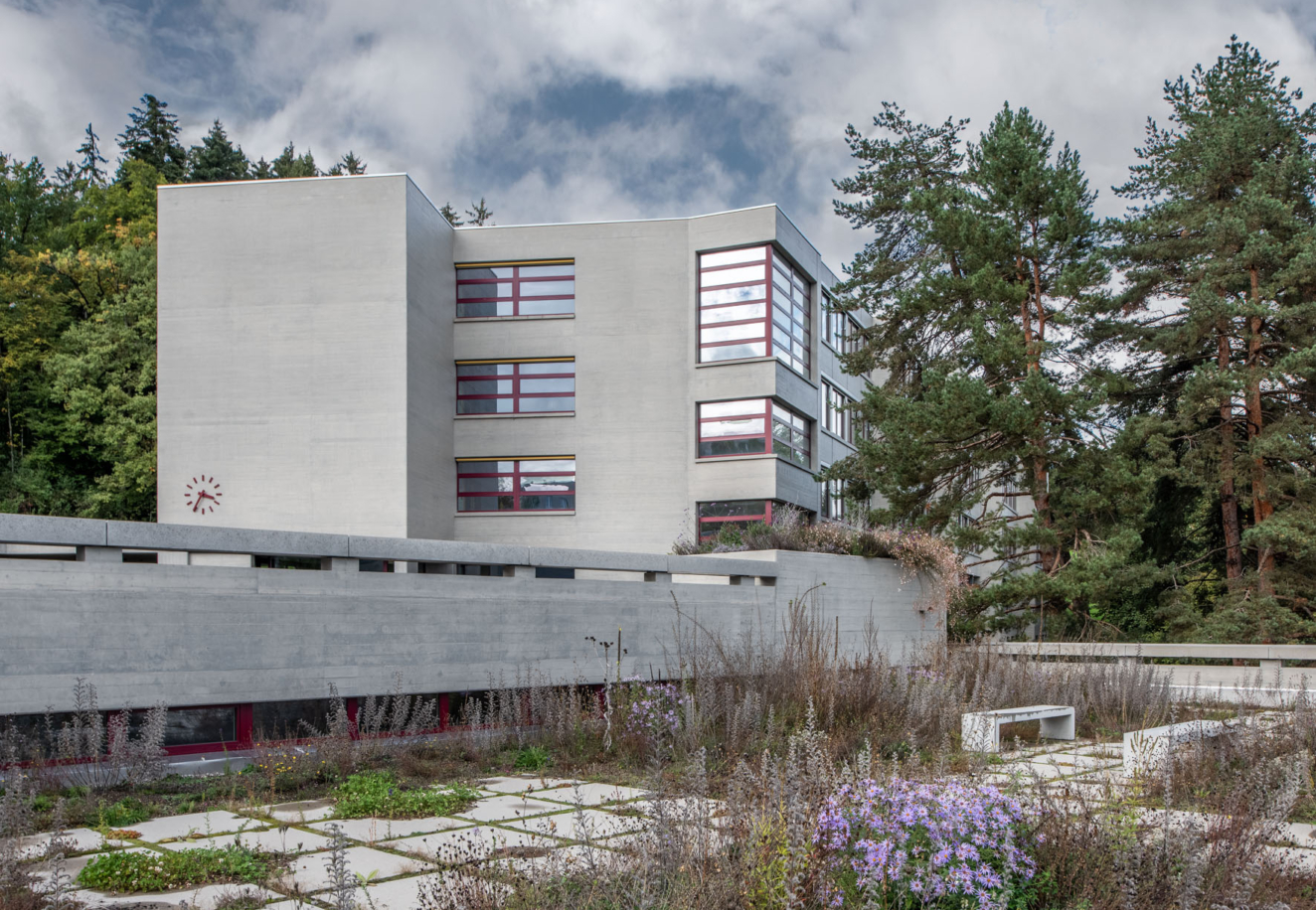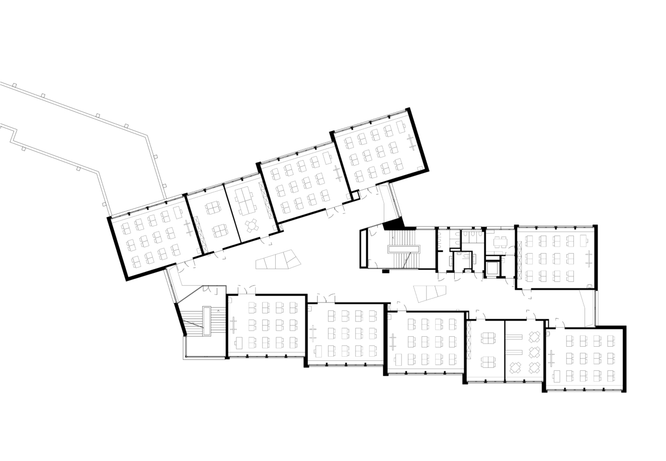 Die fünf Klassenzimmer auf drei Obergeschossen erhalten zweiflüglige Türen mit Glaseinsätzen und weichen die heutige hermetische Beziehung zwischen Klassenzimmer und Gangzone auf – eine fliessende Lernlandschaft entsteht. Sie ist innerhalb der amorphen Raumteiler frei möblierbar und unterstützt moderne Unterrichtsformen.