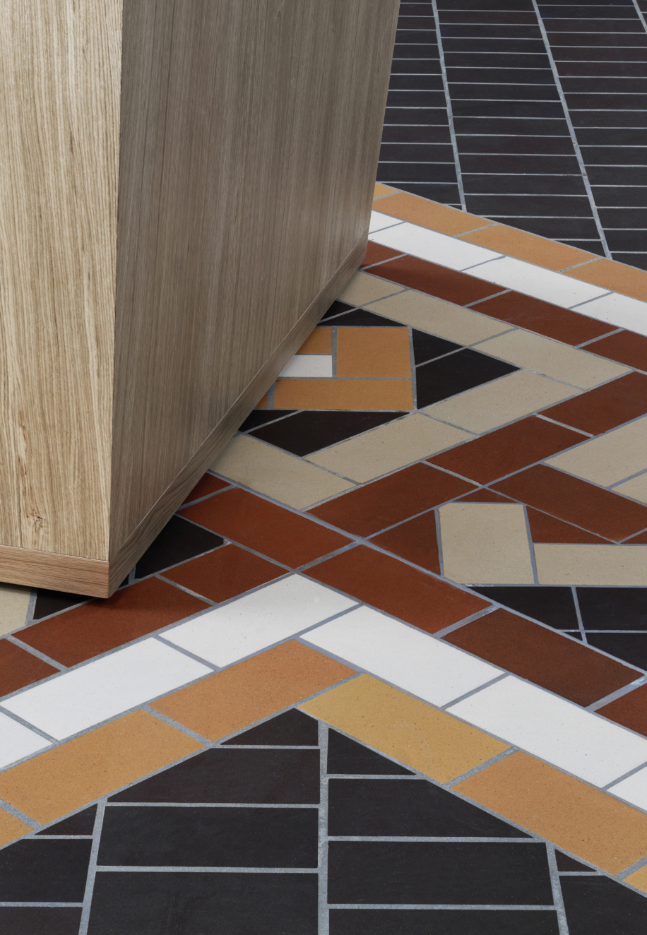 Die Bodenbeläge in den Gangzonen bleiben erhalten. – Sie stellen ein identitätsstiftendes und räumlich prägendes Element dar. – Ihr Muster variiert von Geschoss zu Geschoss innerhalb einer ähnlichen Farbpalette. Der Farbigkeit und Robustheit des Bodens wird eine zurückhaltende Farbigkeit der hell verputzten Wände gegenübergesetzt.