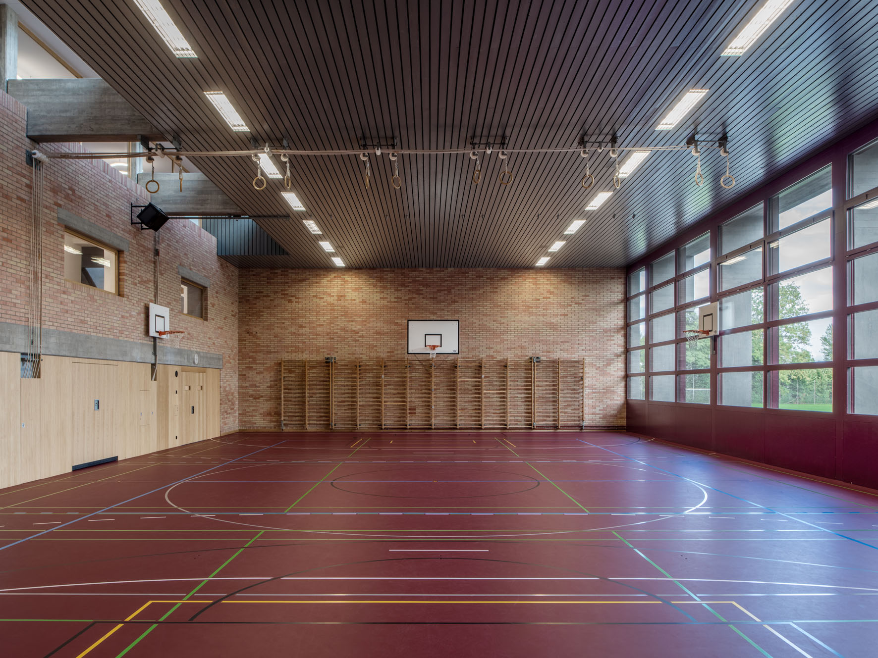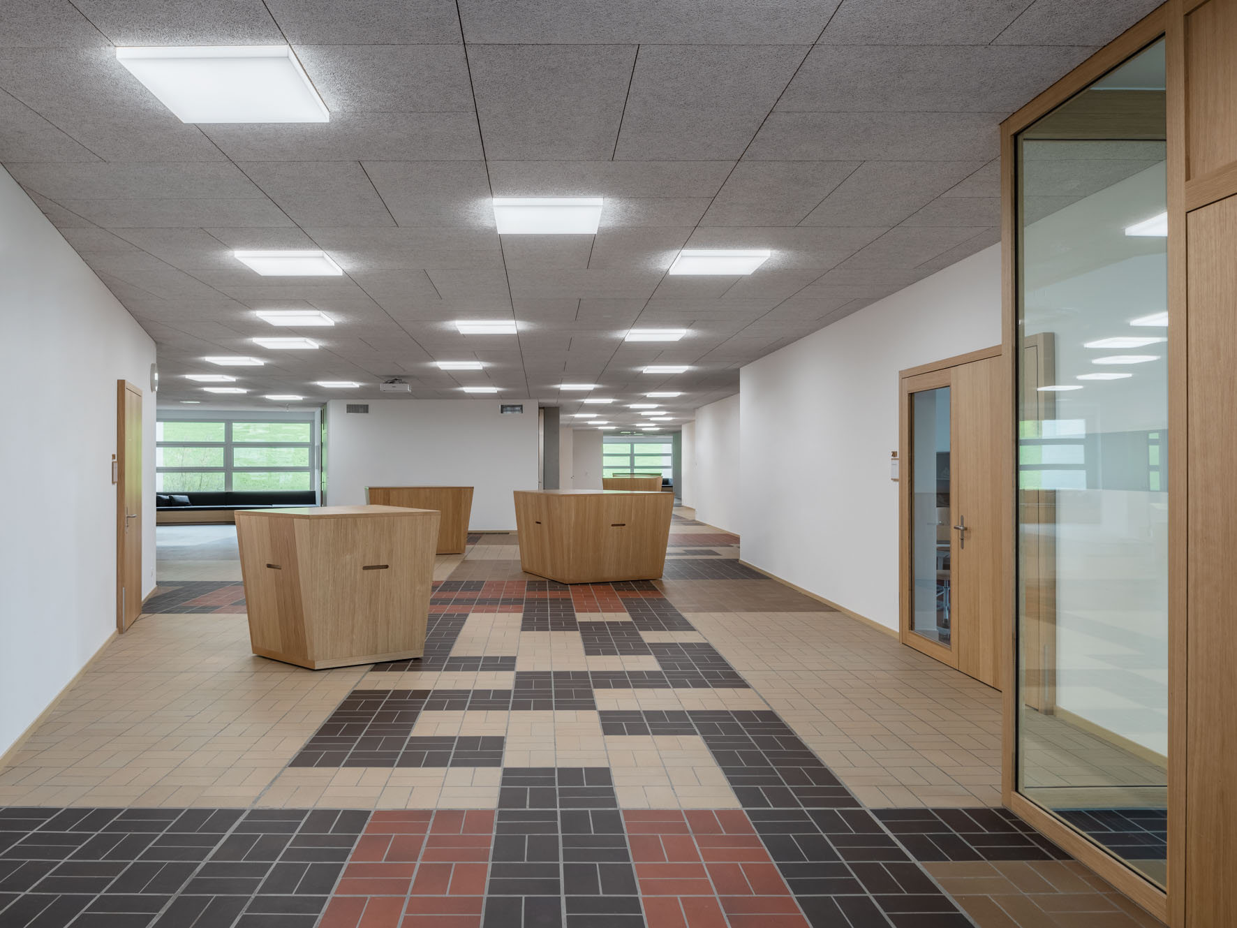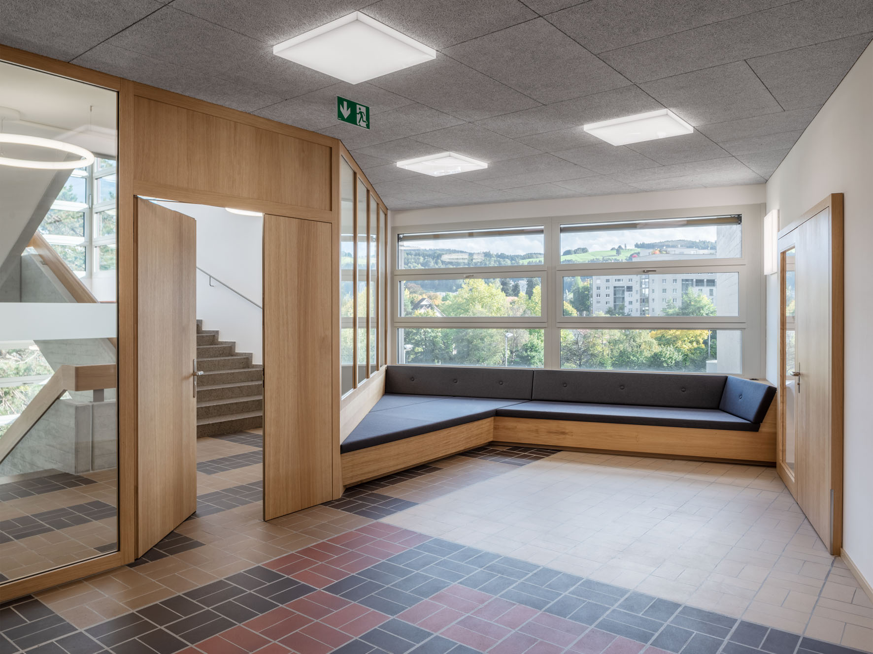 Die fünf Klassenzimmer auf drei Obergeschossen erhalten zweiflüglige Türen mit Glaseinsätzen und weichen die heutige hermetische Beziehung zwischen Klassenzimmer und Gangzone auf – eine fliessende Lernlandschaft entsteht. Sie ist innerhalb der amorphen Raumteiler frei möblierbar und unterstützt moderne Unterrichtsformen.