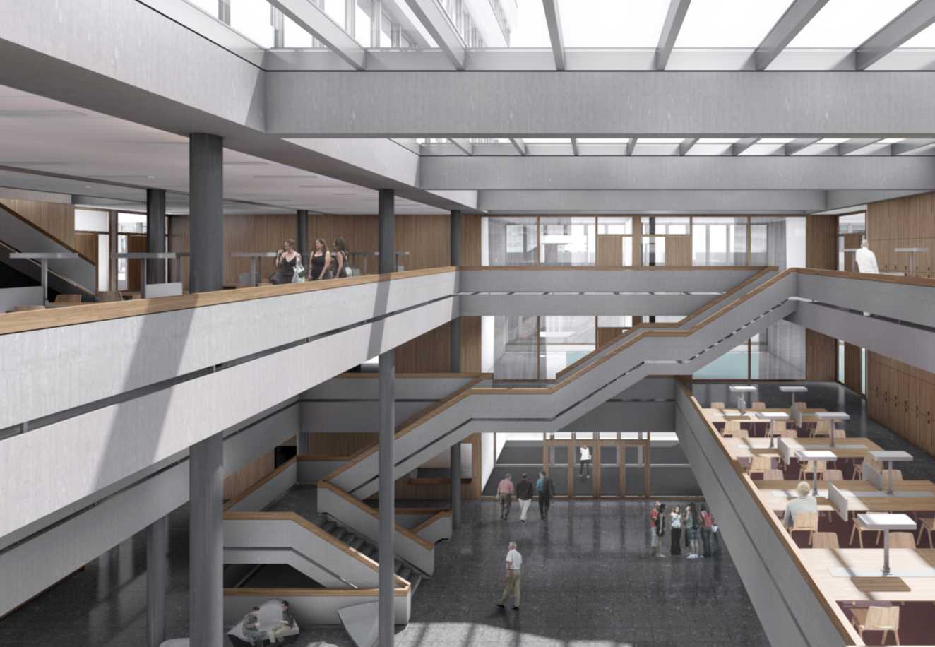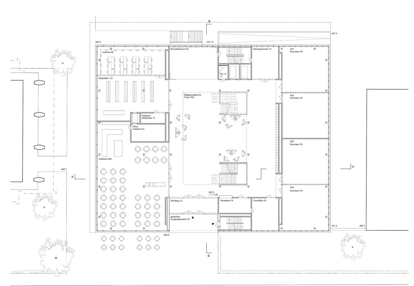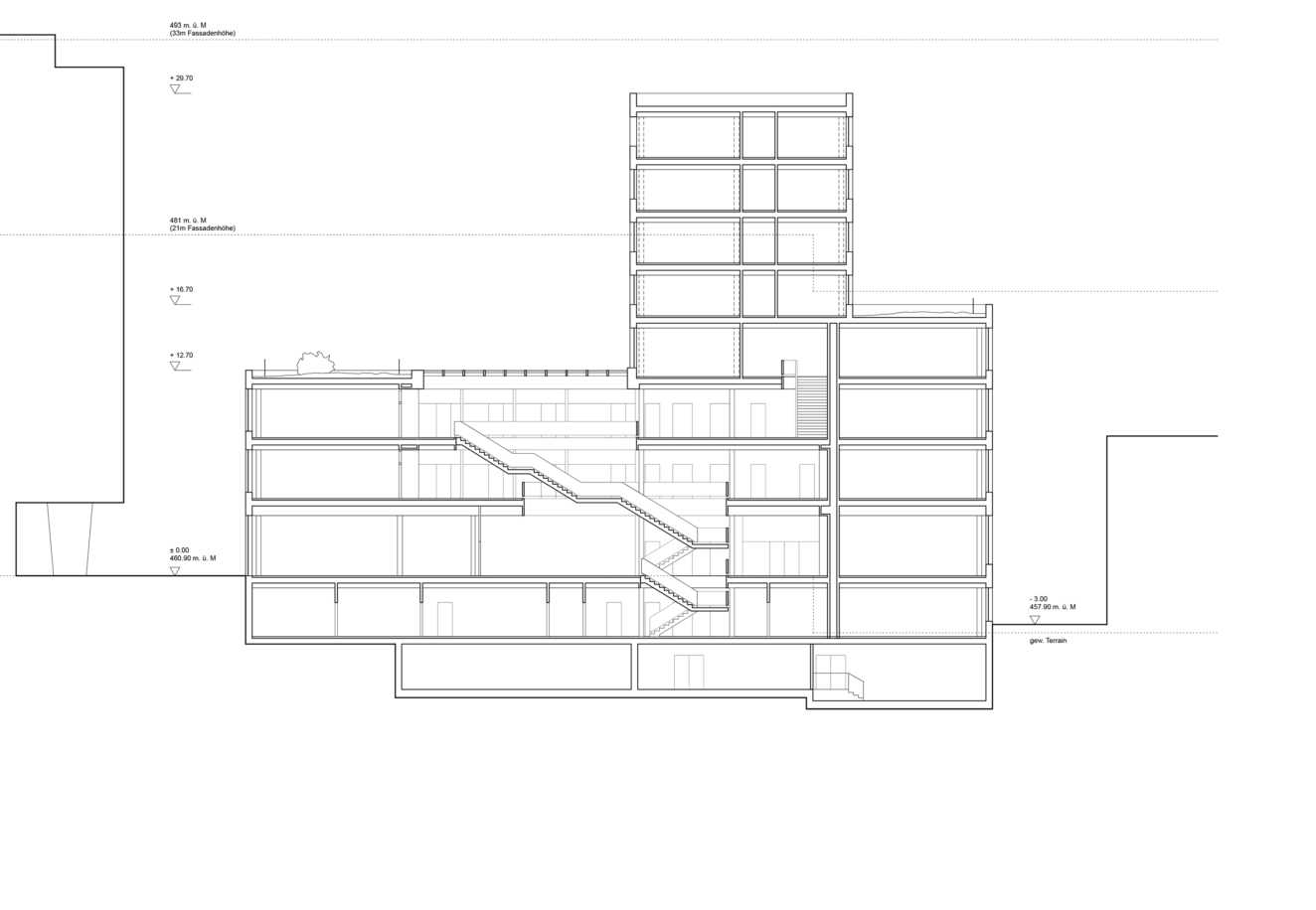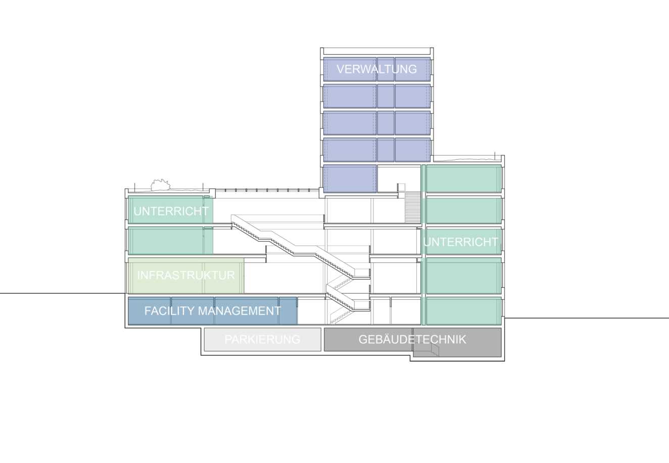 Wegen der engen Platzverhältnisse auf der Parzelle werden räumliche Qualitäten im Inneren des Gebäudes geschaffen. Im Zentrum des flächig organisierten Gebäudesockels liegt die grosszügig angelegte Eingangshalle als Begegnungszone. Im Erdgeschoss liegen weitere öffentliche Räume. Um die dreigeschossige, über ein Oberlicht belichtete Halle, gruppieren sich die Unterrichtsräume. Die Halle zieht den Blick nach oben auf die umlaufenden Galerien. Zwei Kaskadentreppen verbinden die Geschosse, mit ihren Brüstungen verbinden sie den Raum in der diagonalen. Auf den Galerien liegen die Lerninseln für die Studierenden. Diese bieten offene Zusammenarbeits- und Kommunikationsmöglichkeiten. Die kleinen Kursräume liegen in der schmalen Raumschicht an den Längsseiten. Das vierte Obergeschoss fungiert als Vermittler. An der Schnittstelle zwischen Unterrichtsräumen und Verwaltung liegen weitere Kursräume, die Lernberatung und Sitzungszimmer. In Geschossen darüber befindet sich die Verwaltung.