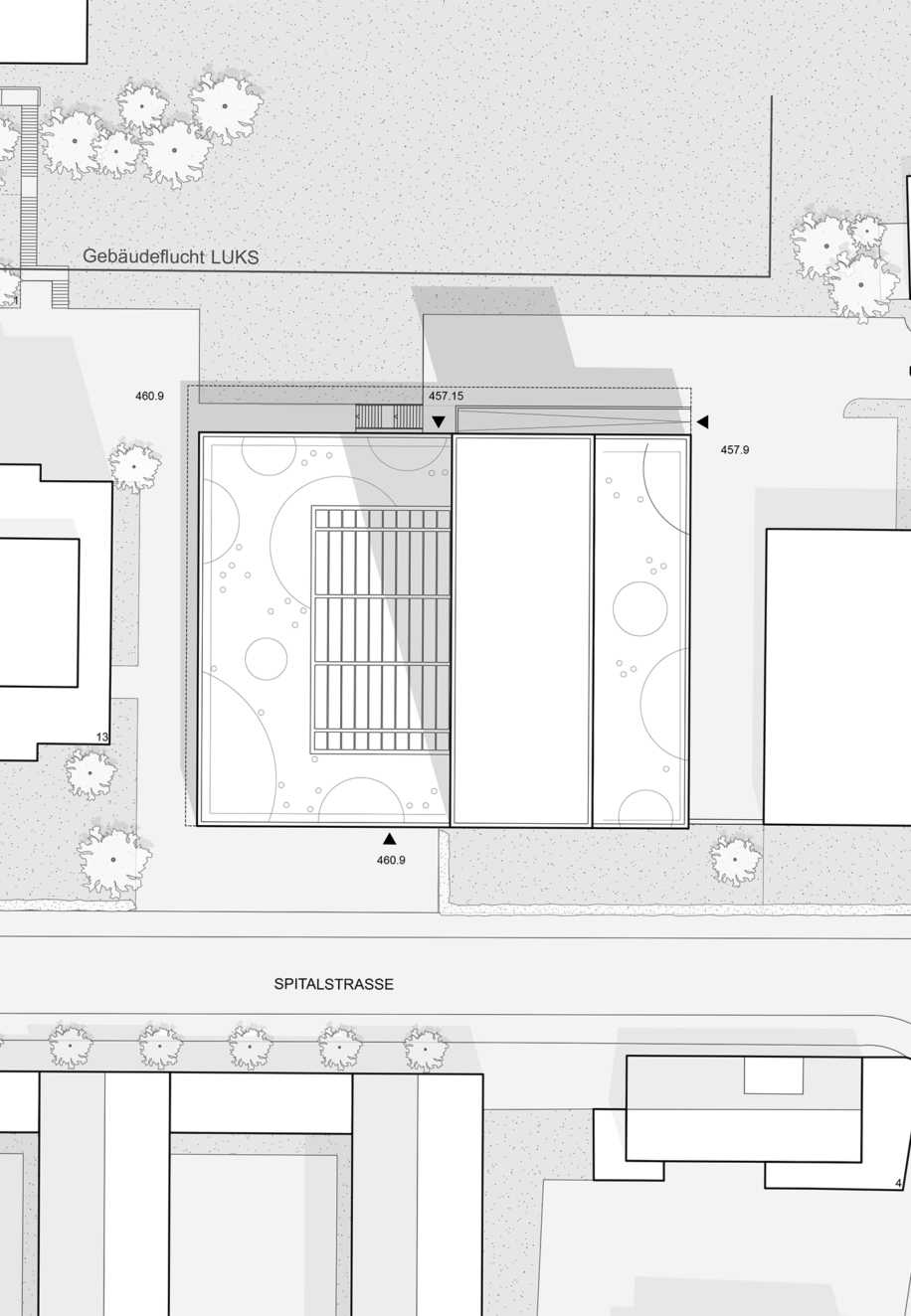 Das Grundstück für den Neubau der Fachhochschule liegt im Nordwesten der Stadt Luzern auf dem Areal des Kantonspitals. Die heterogene Bebauungsstruktur entlang der Spitalstrasse wird durch zwei markante 11-geschossige Hochhäuser akzentuiert. Der gestaffelte Baukörper der neuen Fachhochschule übernimmt mit seinem schmalen 8-geschossigen Gebäudeteil die Höhe der beiden Hochhäuser und markiert einen eigenständigen Auftritt. Die Silhouette des Baukörpers reagiert durch Versprünge auf die Nachbargebäude, dies hält die bauliche Dichte entlang der Spitalstrasse im Gleichgewicht. Die äusserst knappen Verhältnisse im Aussenraum werden durch zwei Dachgärten auf unterschiedlichen Niveaus kompensiert.
