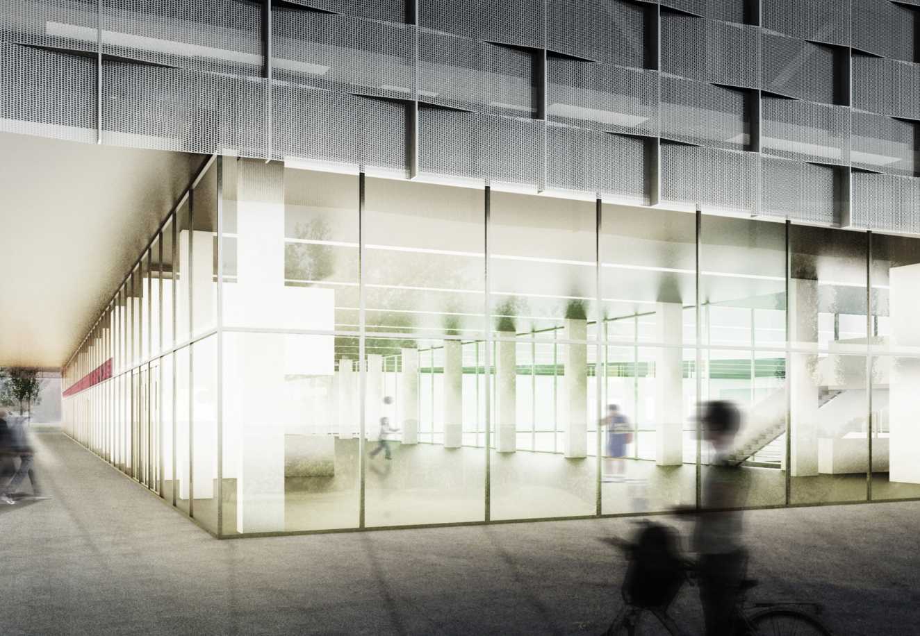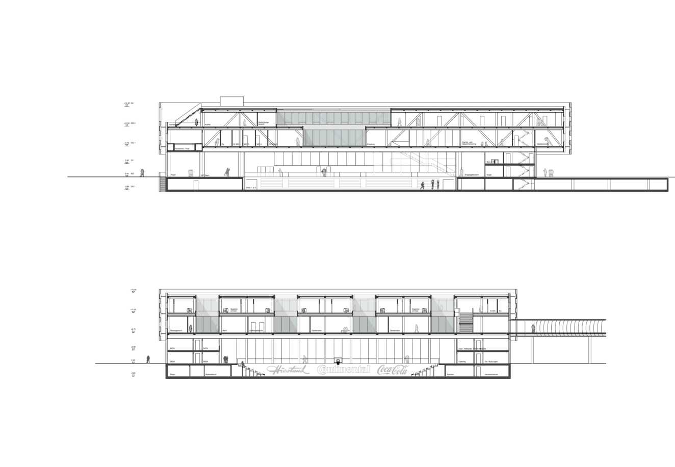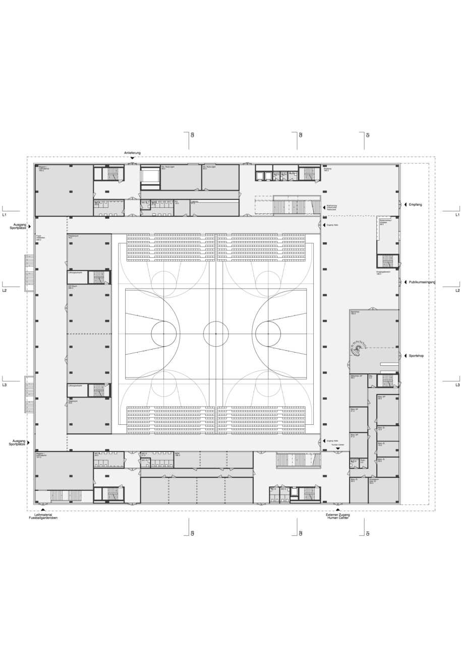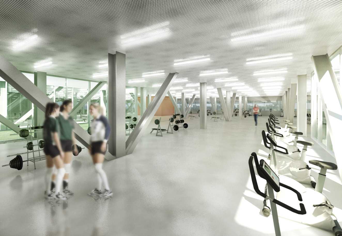 Das transparente Erdgeschoss ermöglicht räumliche Beziehungen in alle vier Himmelrichtungen und verstärkt den schwebenden Charakter des Baukörpers. Horizontale Bänder aus alufarbigem Lochblech bilden die durchlässige Hülle der Obergeschosse. Die Funktionen werden horizontal gestapelt: Im Erdgeschoss liegen die Sporthallen, der Krafttrainingsbereich belegt das 1. und die Bewirtschaftungs- und Übernachtungsräume befinden sich im 2. Obergeschoss. Atmosphärisch werden die Unterkünfte in Form eines „Sportklosters“ konzipiert.