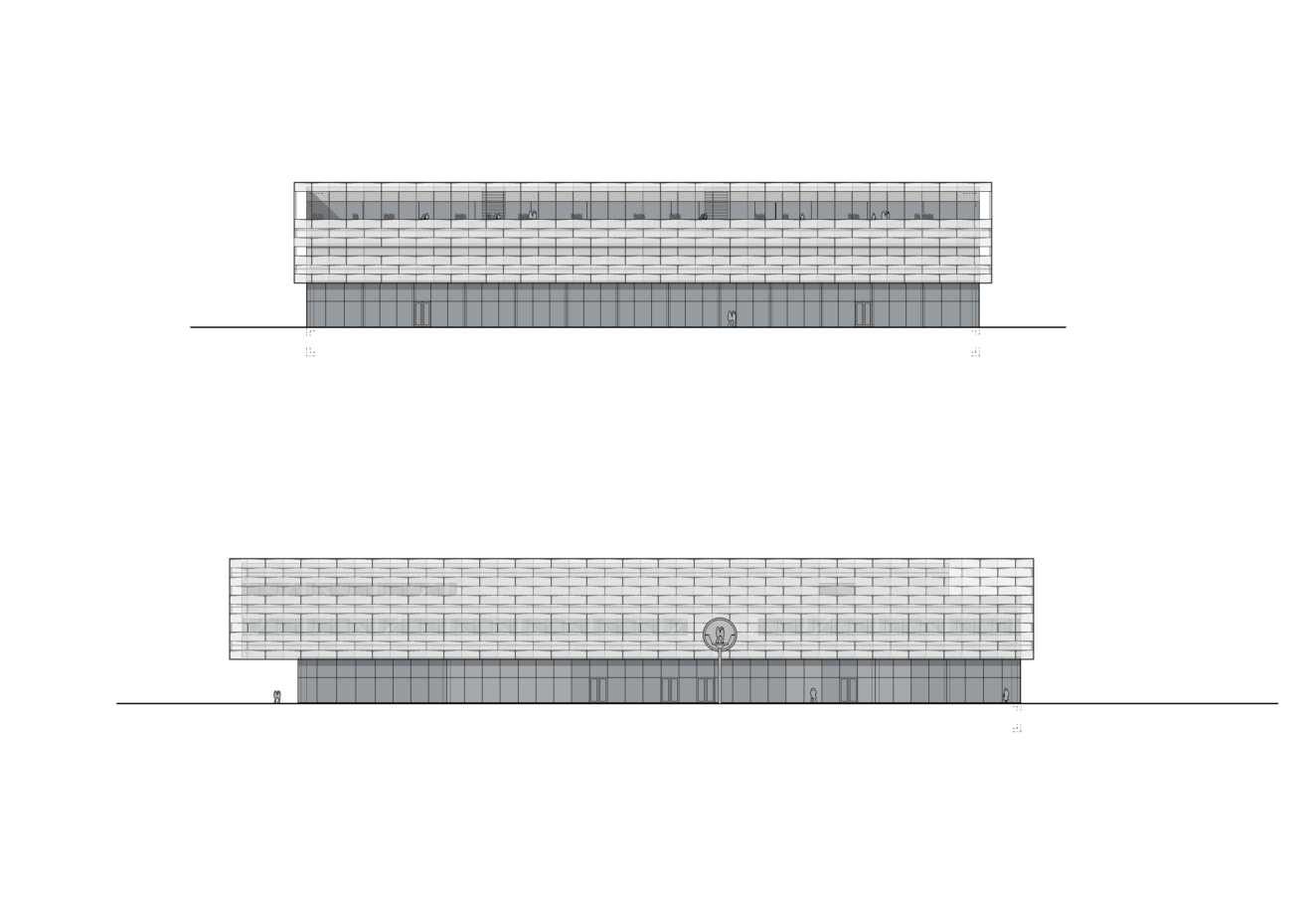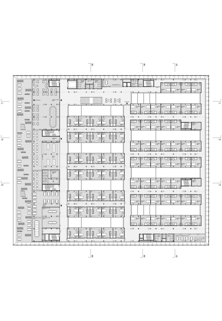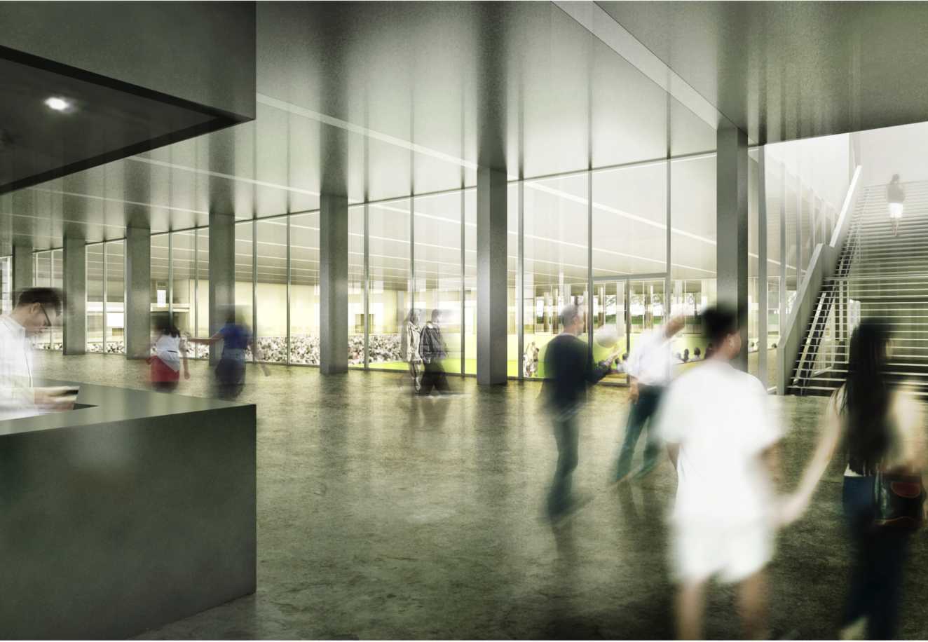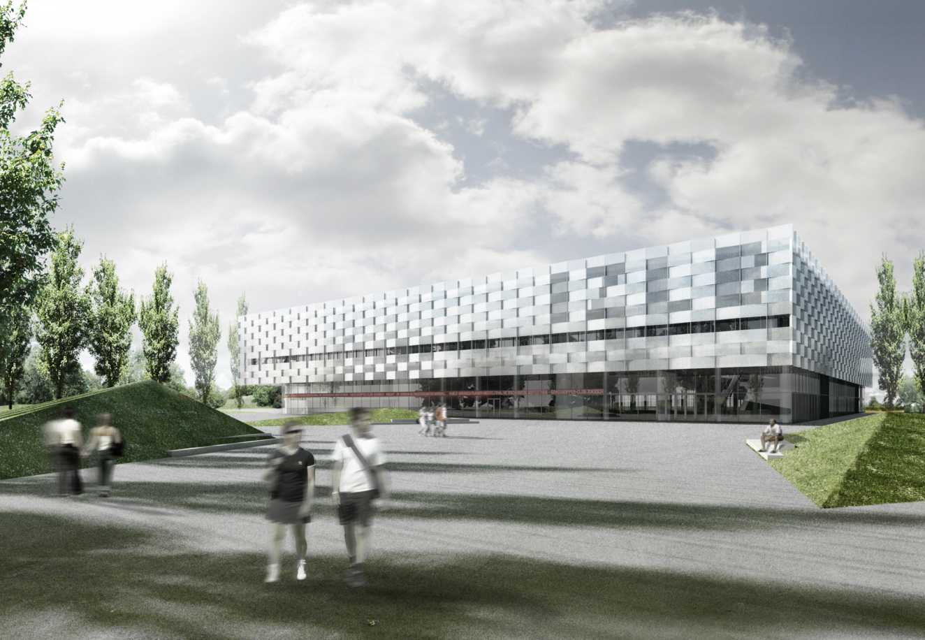 Das transparente Erdgeschoss ermöglicht räumliche Beziehungen in alle vier Himmelrichtungen und verstärkt den schwebenden Charakter des Baukörpers. Horizontale Bänder aus alufarbigem Lochblech bilden die durchlässige Hülle der Obergeschosse. Die Funktionen werden horizontal gestapelt: Im Erdgeschoss liegen die Sporthallen, der Krafttrainingsbereich belegt das 1. und die Bewirtschaftungs- und Übernachtungsräume befinden sich im 2. Obergeschoss. Atmosphärisch werden die Unterkünfte in Form eines „Sportklosters“ konzipiert.