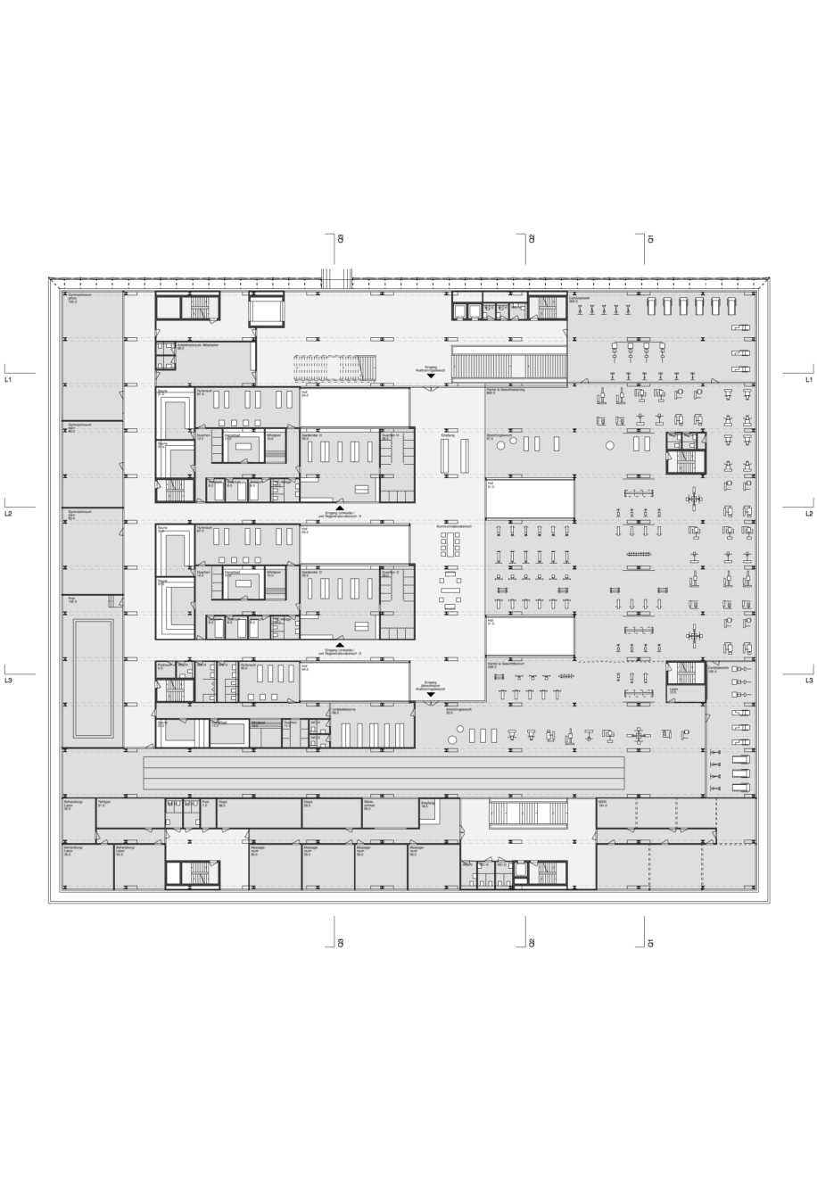 Örtlich eingekerbte Sitzkanten schaffen Aufenthaltsbereiche in der gefalteten Platzlandschaft, vertikale „Pappelvorhänge“ definieren präzise Raumkanten. Die windgeschützte Dachterrasse ist Lounge und Bar zugeordnet, in den flächigen Holzrost sind luftig-leichte Gräsertuffs eingeschriebenen – ein „Windgarten“ mit trockenheitsresistenten Steppengräsern.