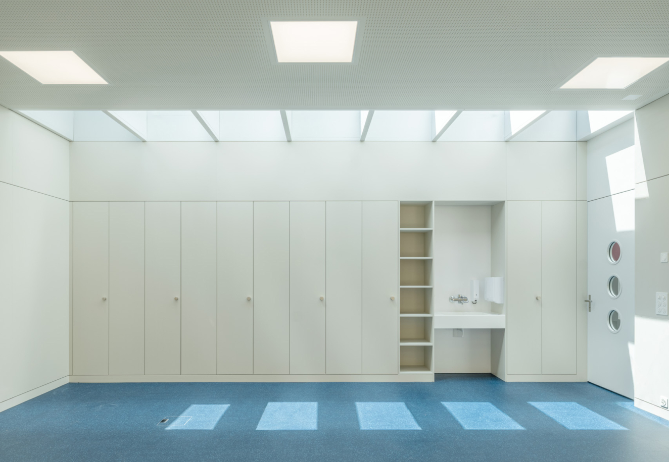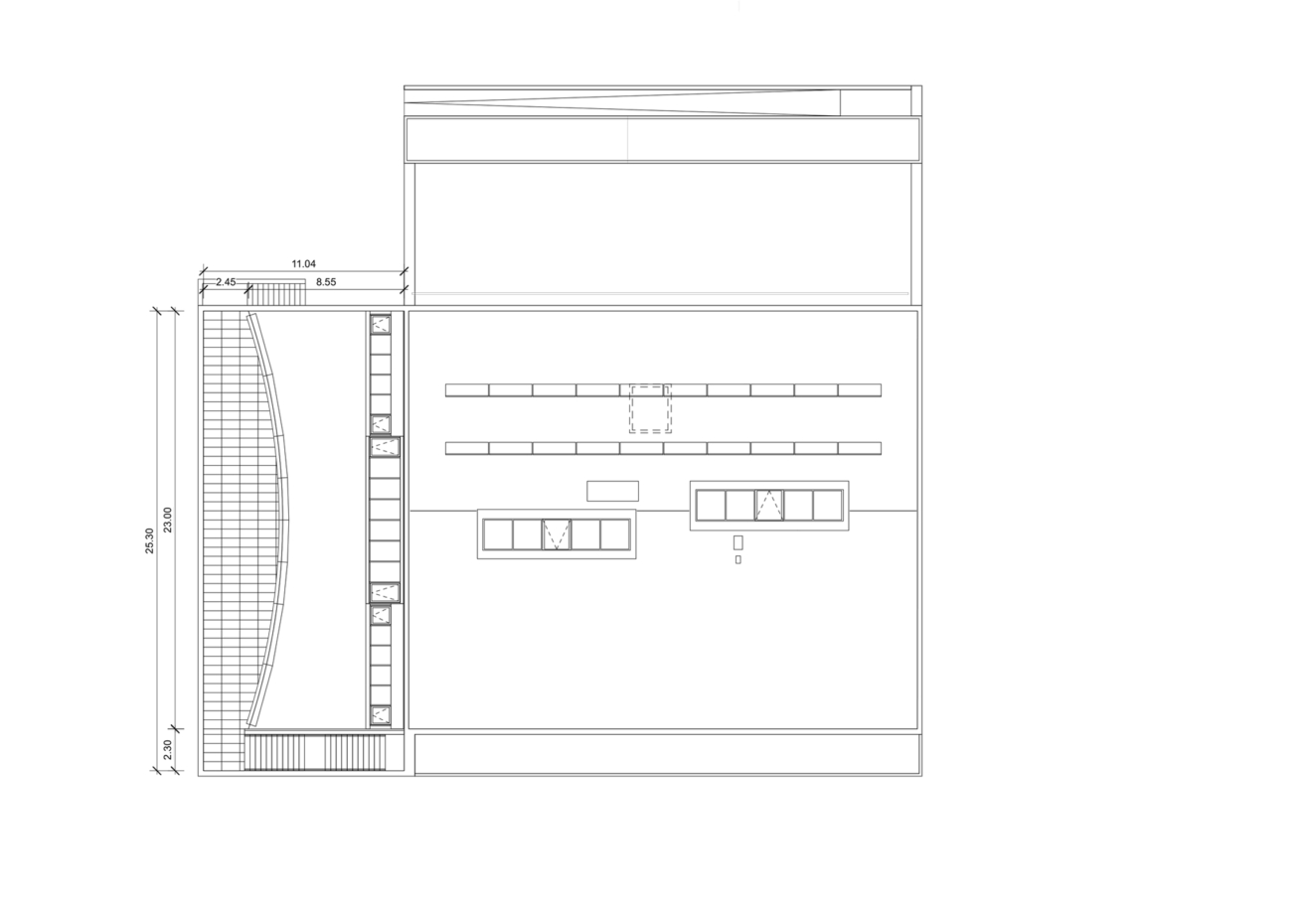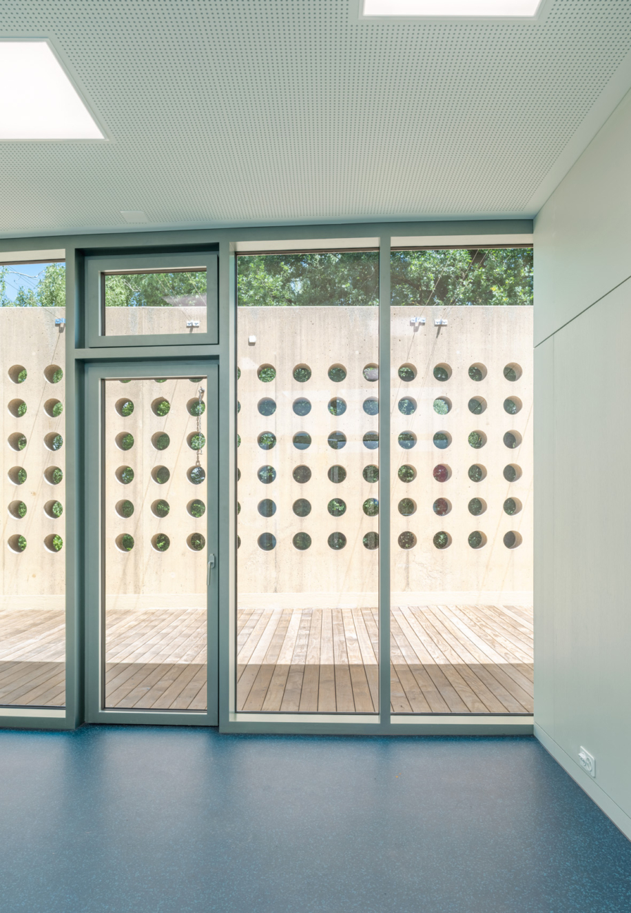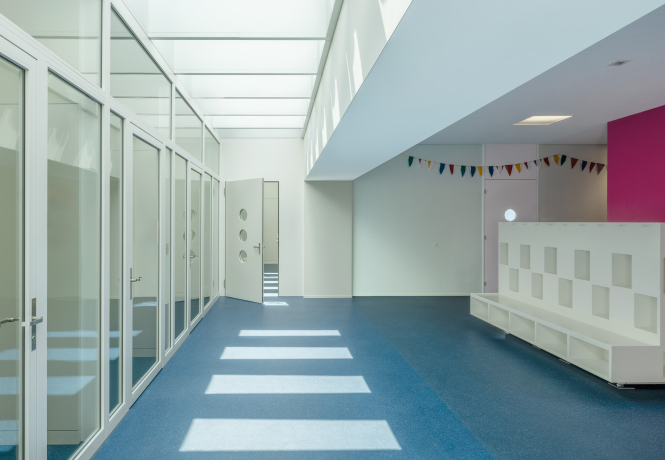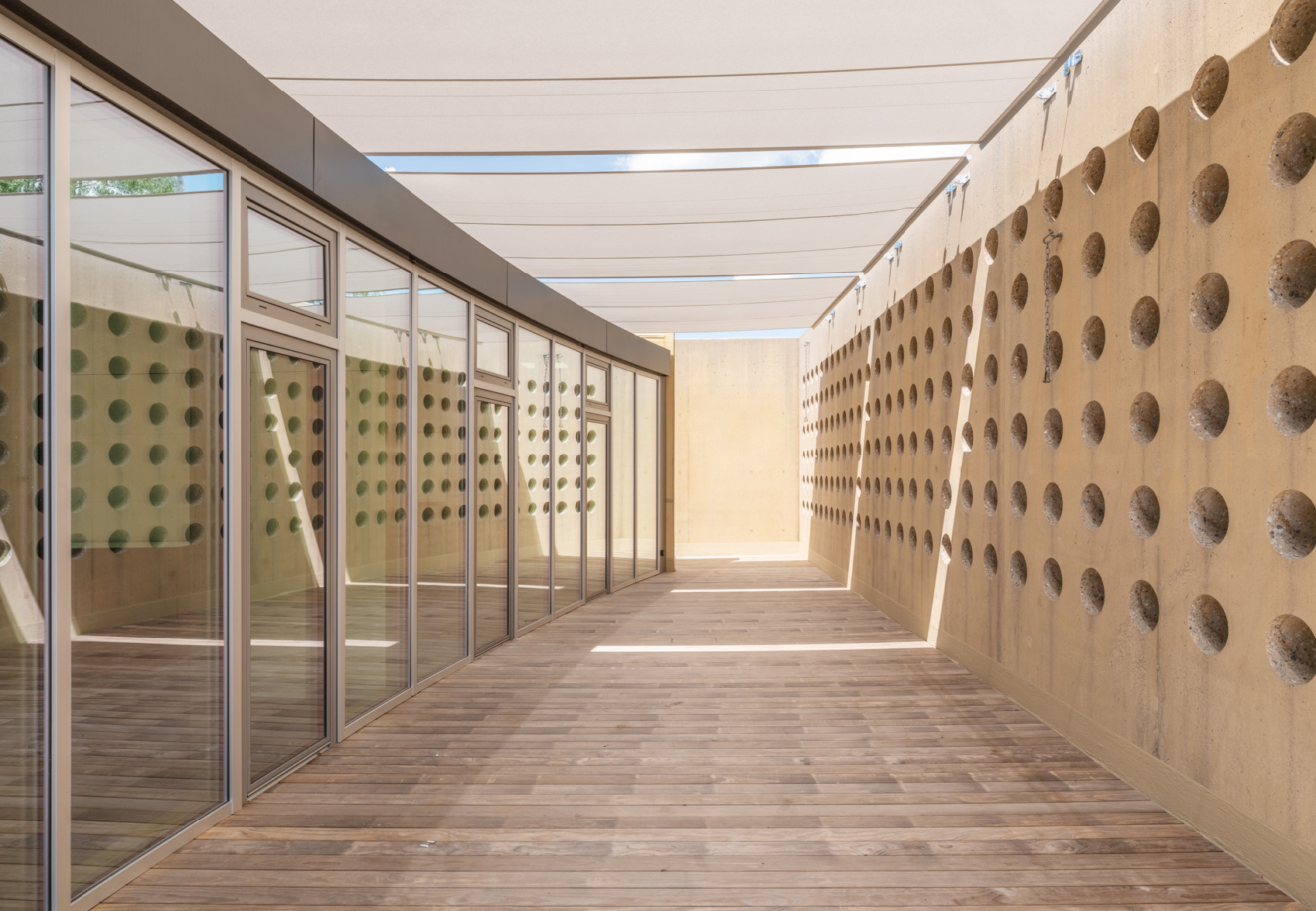 Auf dem aussenliegenden Terrassenhof im 1.Obergeschoss (Aussenklassenzimmer) wird in Holzständerbauweise eine interne Erweiterung mit zwei Klassenzimmern und zwei Gruppenräumen realisiert. Der neue Baukörper wird in die vorhandene Struktur hineingestellt und schliesst zweiseitig an bestehende Aussenwände an. Die Brüstung der Aussentreppe wird erhöht und bildet den Abschluss an der dritten Seite. Eine geschwungene Glasfront schliesst die Erweiterung zur perforierten Aussenwand (Nord-Ost-Fassade) hin ab, sodass ein schmaler Aussenbereich erhalten bleibt.