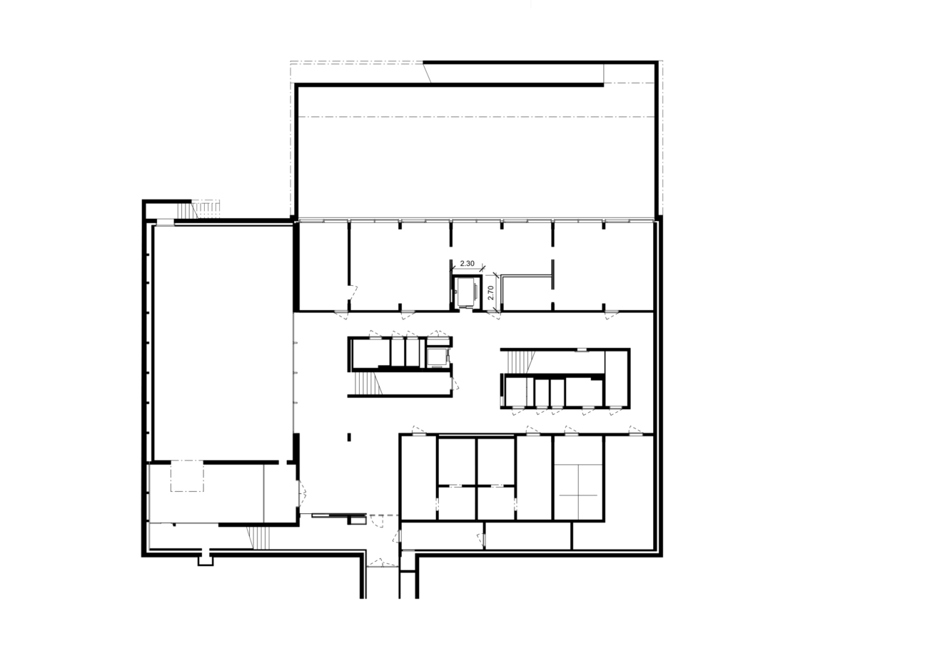 Der zusätzliche Lift wird in der süd-östlichen Raumschicht integriert. Die Türe öffnet auf den bestehenden Erschliessungsbereich in der Gebäudemitte. Für den neuen Liftschacht müssen die beiden Decken zwischen UG und 1.OG, sowie die Bodenplatte geöffnet werden. Durch die geringe Überfahrtshöhe können aufwändige Anpassungsarbeiten am bestehenden Dach verhindert werden.