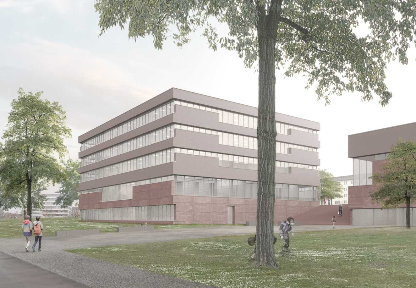 Die beiden Baukörper werden versetzt angeordnet, so dass eine starke räumliche Verbindung zum Grünraum erreicht wird. Die inszenierte Freitreppe öffnet die Schulanlage gegenüber dem Quartier und bildet ein Scharnier zum öffentlichem Grünraum. Daraus resultiert eine direkte Anbindung der neu erstellten Wohnbauten auf dem Freilagerareal mit dem Schulgebäude. Gleichzeitig wird der Grünraum gut an die Aussenanlagen der Schule angebunden.