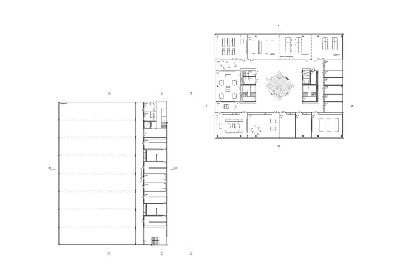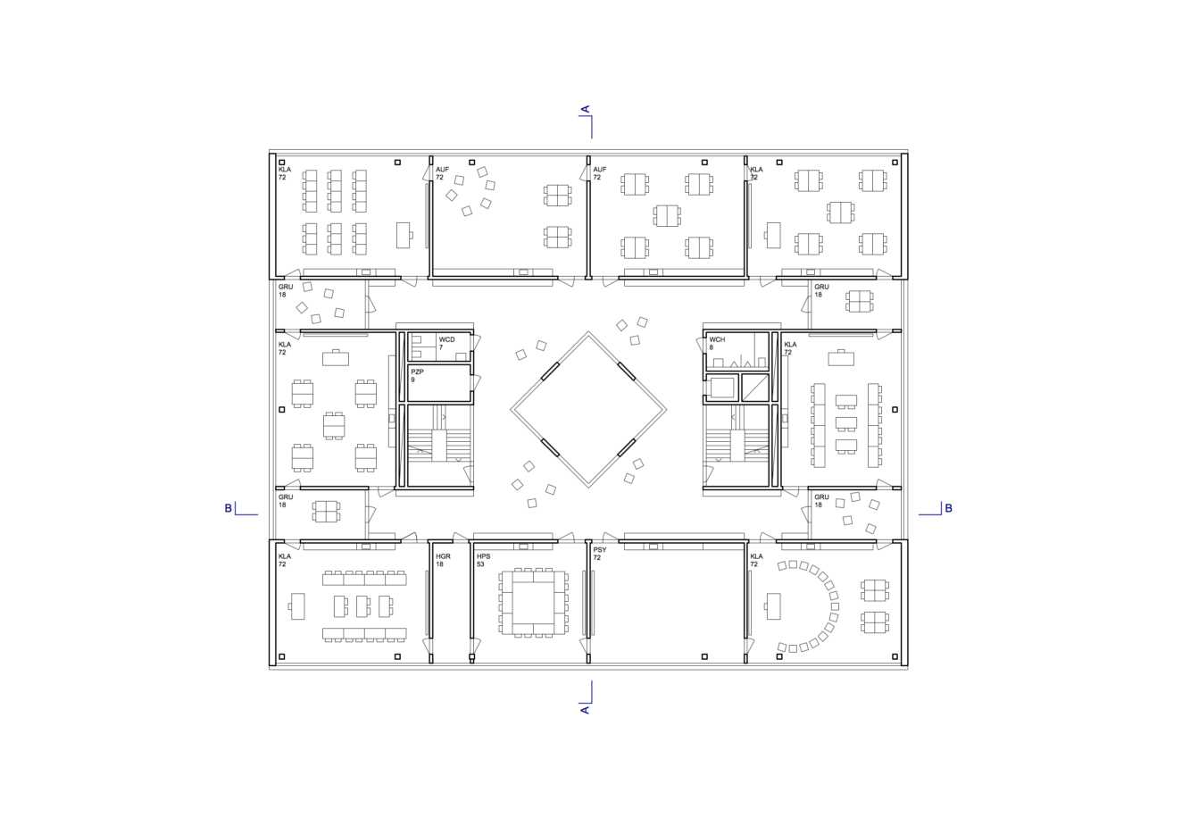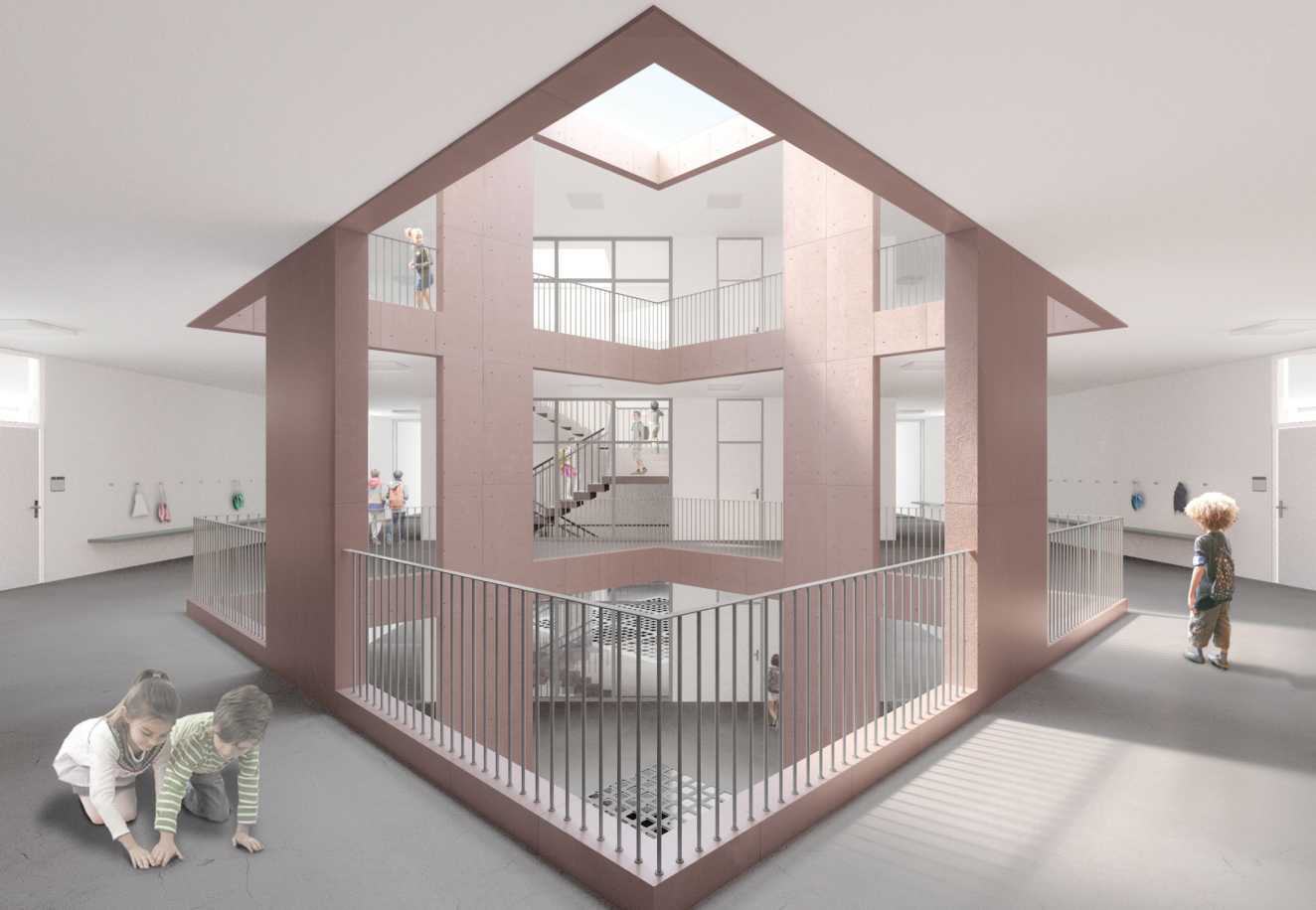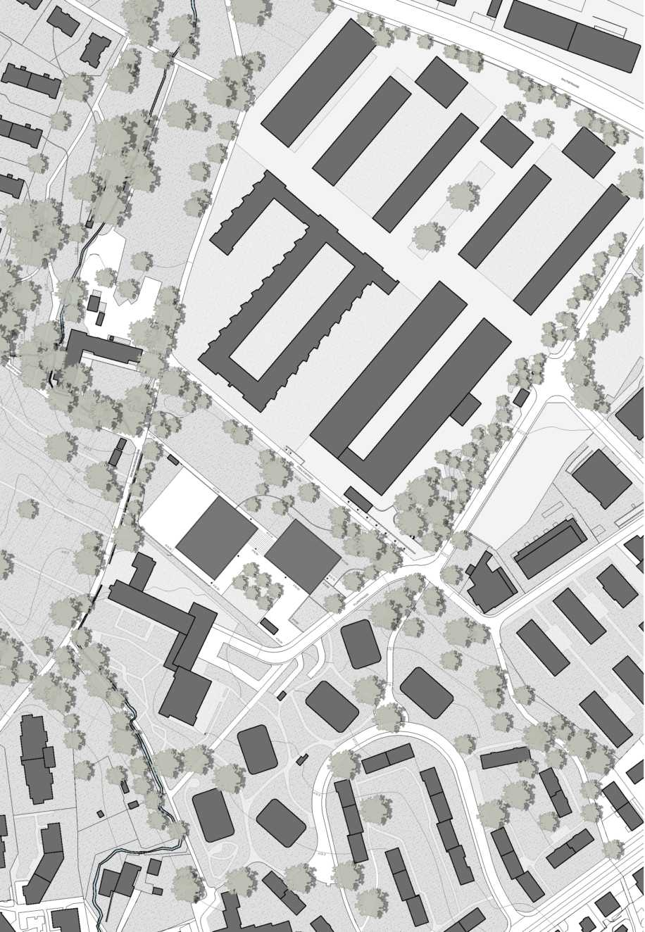 Mit einer klaren, kompakten Setzung wird das Raumprogramm auf zwei Baukörper von unterschiedlicher Geschossigkeit verteilt. Die Schulanlage wird als Teil vom durchgrünten Stadtkörper gelesen, bezüglich geometrischer Ausrichtung und Massstäblichkeit orientiert sich das Projekt aber am kompakten Stadtkörper des Freilager Areals und vermittelt zwischen den beiden Strukturen. Mit seiner markanten, bildhaften Erscheinung erhält das Quartier eine Schulanlage von grossem Identifikationspotential.