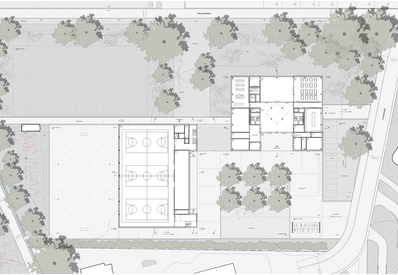 Der Pausenplatz erschliesst das Schulgebäude und die beiden Turnhallen. Eine Rampe verbindet den Pausenplatz mit dem Allwetterplatz, der als erweiterter Pausenplatz gelesen wird. Parallel zum Freilagerweg wird eine zweite Fusswegachse eingeführt, welche direkt auf die Freitreppe führt. Über diesen Fussweg wird die Schulschwimmanlage direkt von Aussen erschlossen.