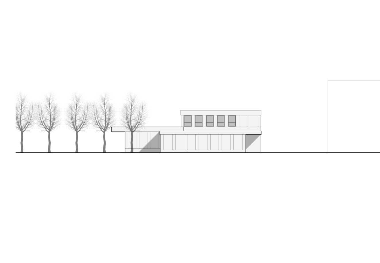 Ein alusilberner Farbanstrich der horizontal oder vertikal gerichteten Holzschalungen verleiht dem Gebäude einen schillernden, industriellen Ausdruck. Im Gegensatz dazu schafft der Innenausbau mit naturbelassenem Holz in den Schulungsräumen eine angenehme und angemessene Atmosphäre. Als Sonnenschutz werden textile, vertikale Sonnenstoren vorgeschlagen.