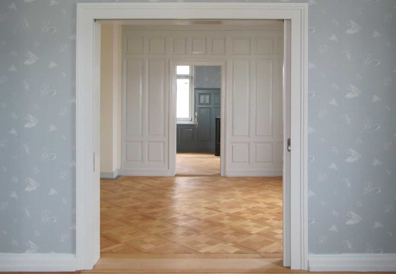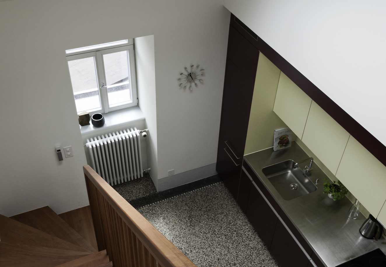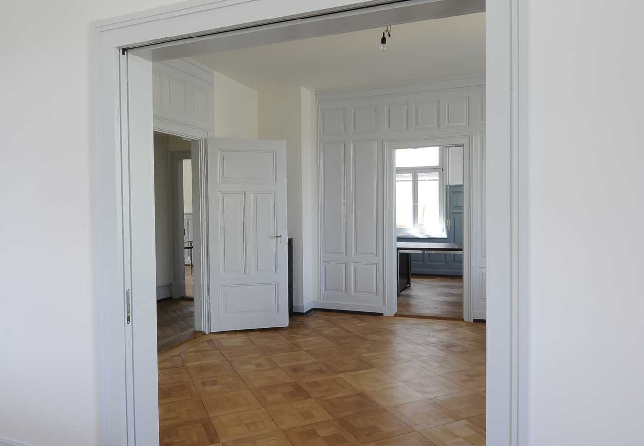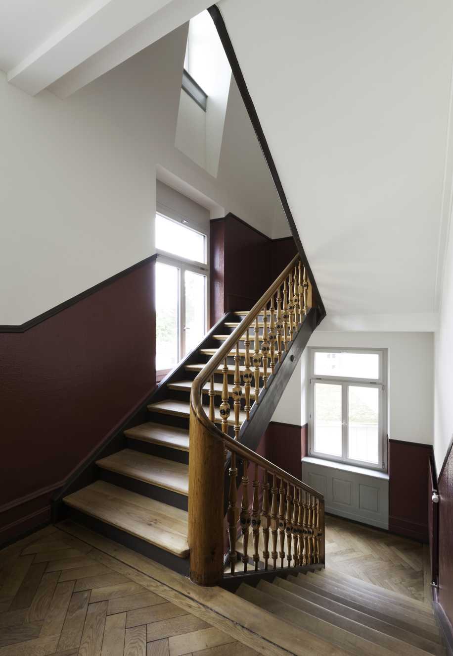 Die klassizistische Architektursprache wurde auch im Innern herausgearbeitet: Die originalen Kassetten- oder Riemenparkettböden wurden abgeschliffen. Auf den Wänden eine abstrakt-ornamentale Tapete mit Faunamotiven angebracht und das Täfer in verschiedenen Grünnuancen gestrichen. Das Tiefrot der Küche bildet ein Echo zur blauschwarzen Farbe des fliesenlosen Bades. Einen lebendigen Kontrast schafft der alte Terrazzoboden. Für die aufwendigen Holzarbeiten wurde die Thurgauer Elsbeere gewählt.