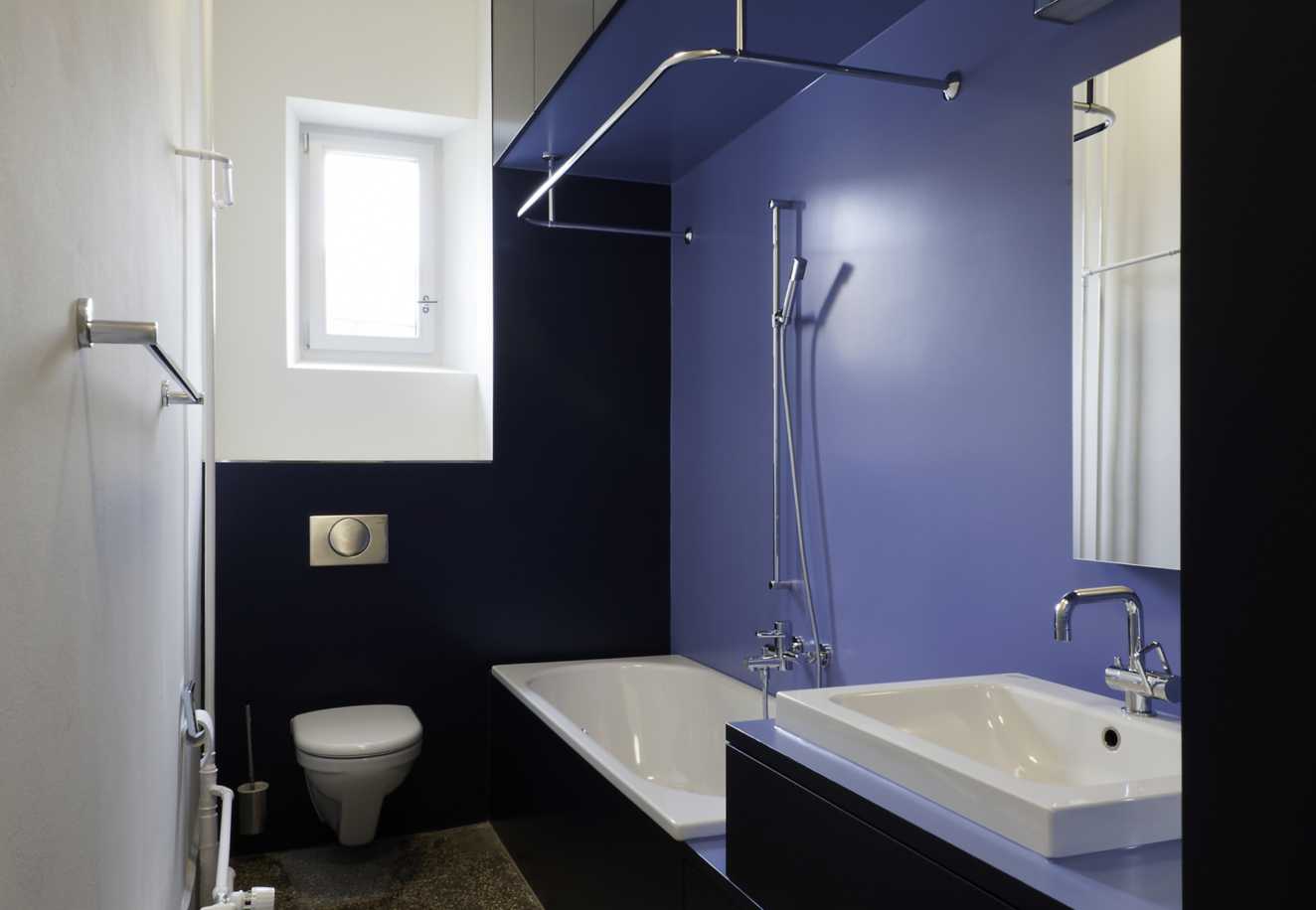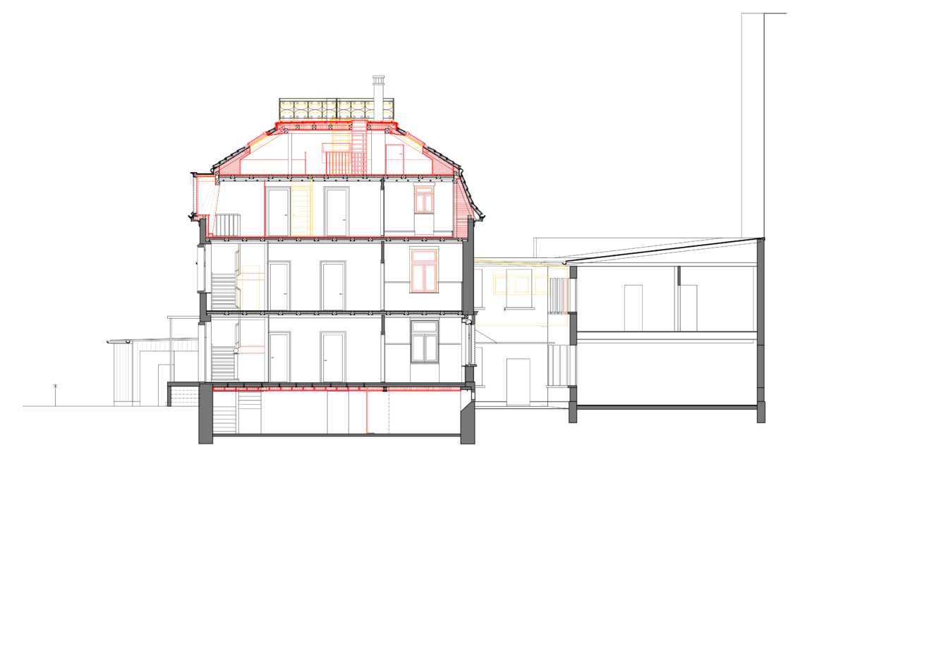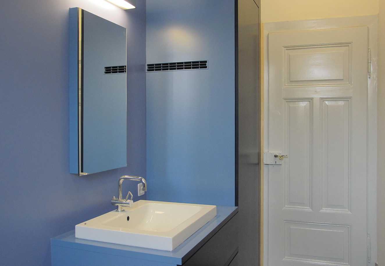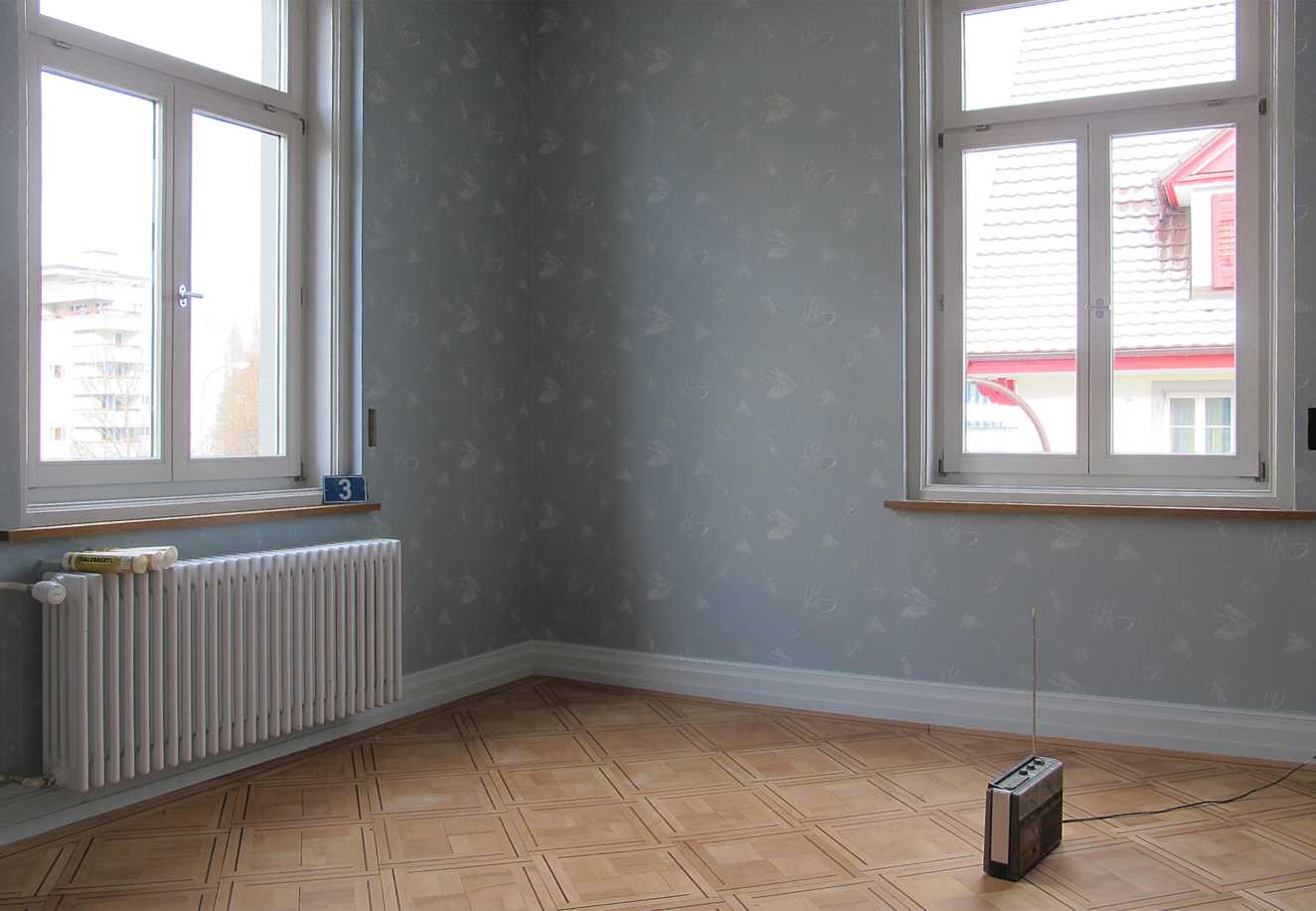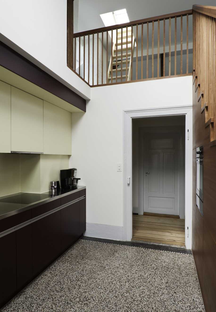 Die klassizistische Architektursprache wurde auch im Innern herausgearbeitet: Die originalen Kassetten- oder Riemenparkettböden wurden abgeschliffen. Auf den Wänden eine abstrakt-ornamentale Tapete mit Faunamotiven angebracht und das Täfer in verschiedenen Grünnuancen gestrichen. Das Tiefrot der Küche bildet ein Echo zur blauschwarzen Farbe des fliesenlosen Bades. Einen lebendigen Kontrast schafft der alte Terrazzoboden. Für die aufwendigen Holzarbeiten wurde die Thurgauer Elsbeere gewählt.