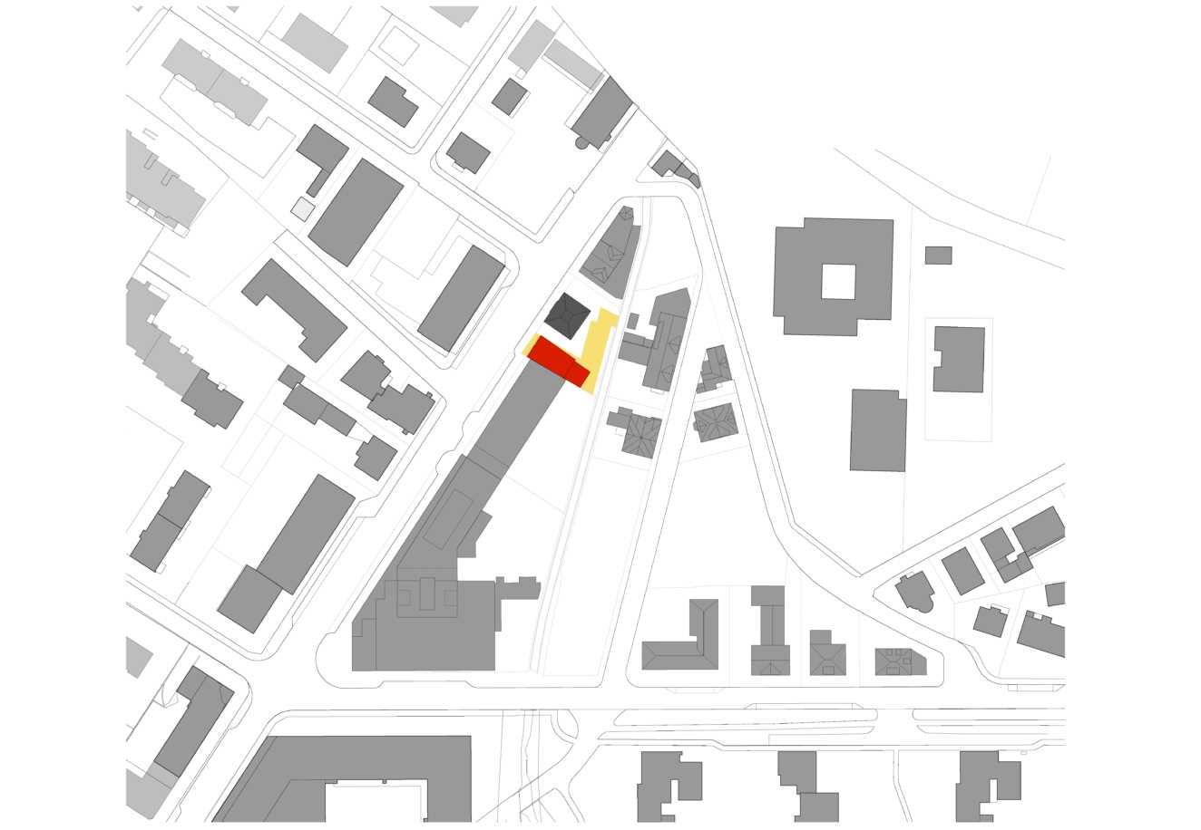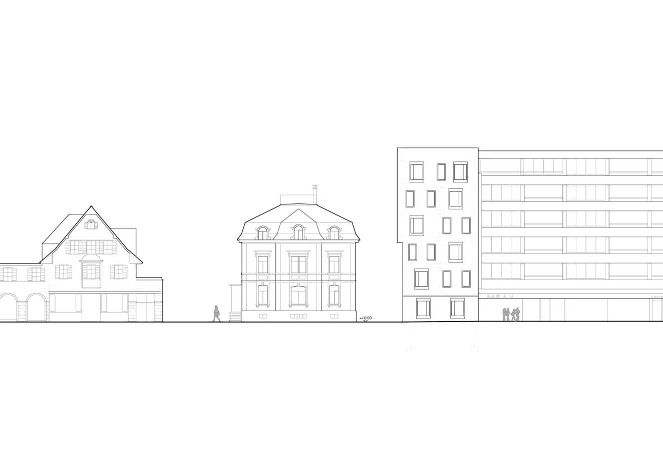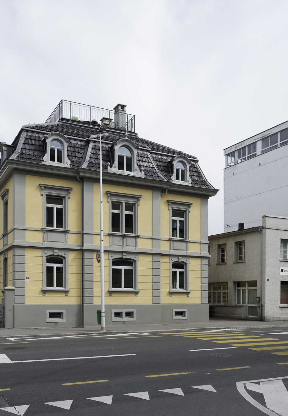 Die Konstanzerstrasse zeichnet sich durch eine ausgeprägte Heterogenität aus. Die Zäsur zwischen dem klassizistischen Prachtbau und der Brandmauer der 6 bis 8-geschossigen Geschäftshäuser wirkt wie eine städtebauliche Wunde. Es herrscht eine erstaunliche Unkonzentriertheit in solcher Proximität zur präzisen Landesgrenze. Beim geplanten Neubau handelt es sich deshalb um eine Weiterentwicklung im Geist der 60er Jahre, mit respektvoller Referenz gegenüber dem Altbau, der – von der Andockung an das Werkstattgebäude befreit – wieder als Kubus dasteht.