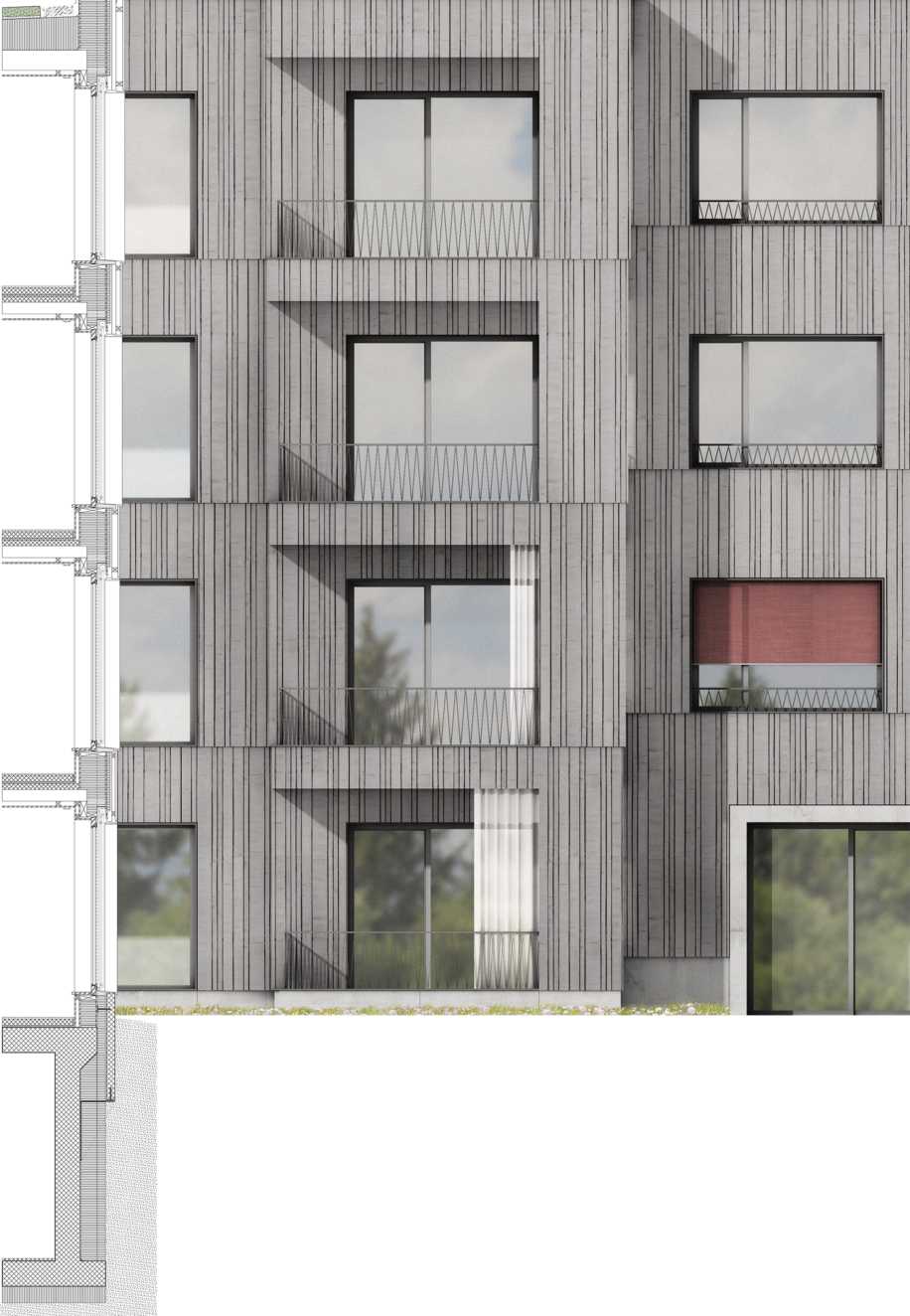 Offen gefugte, vertikale Holzbretter in unterschiedlichen Breiten zeichnen die Geschosse mittels leichtem Überstand aus. Die Lasurbeschichtung wird über die einzelnen Häuser hinweg farblich leicht nuanciert.