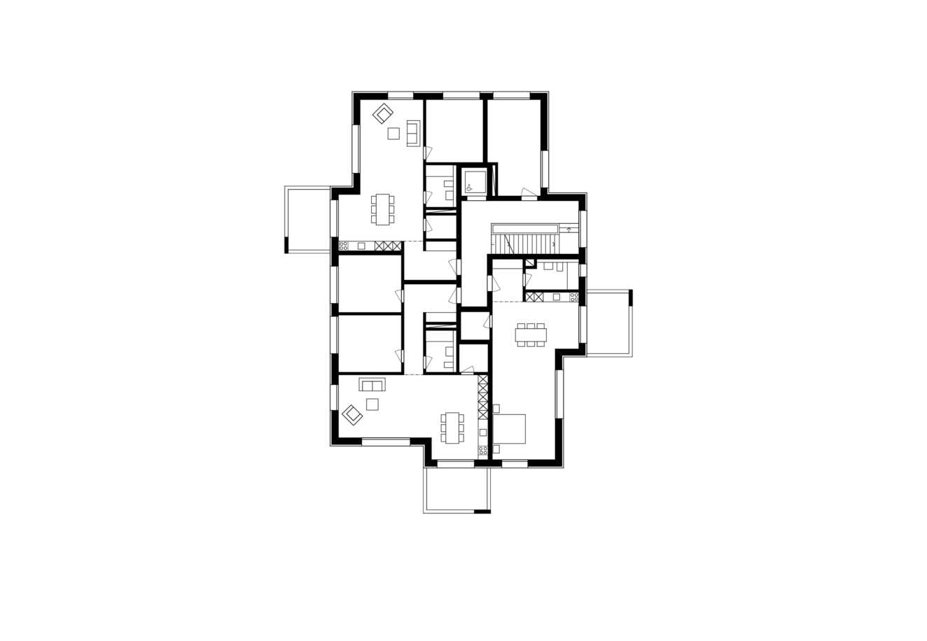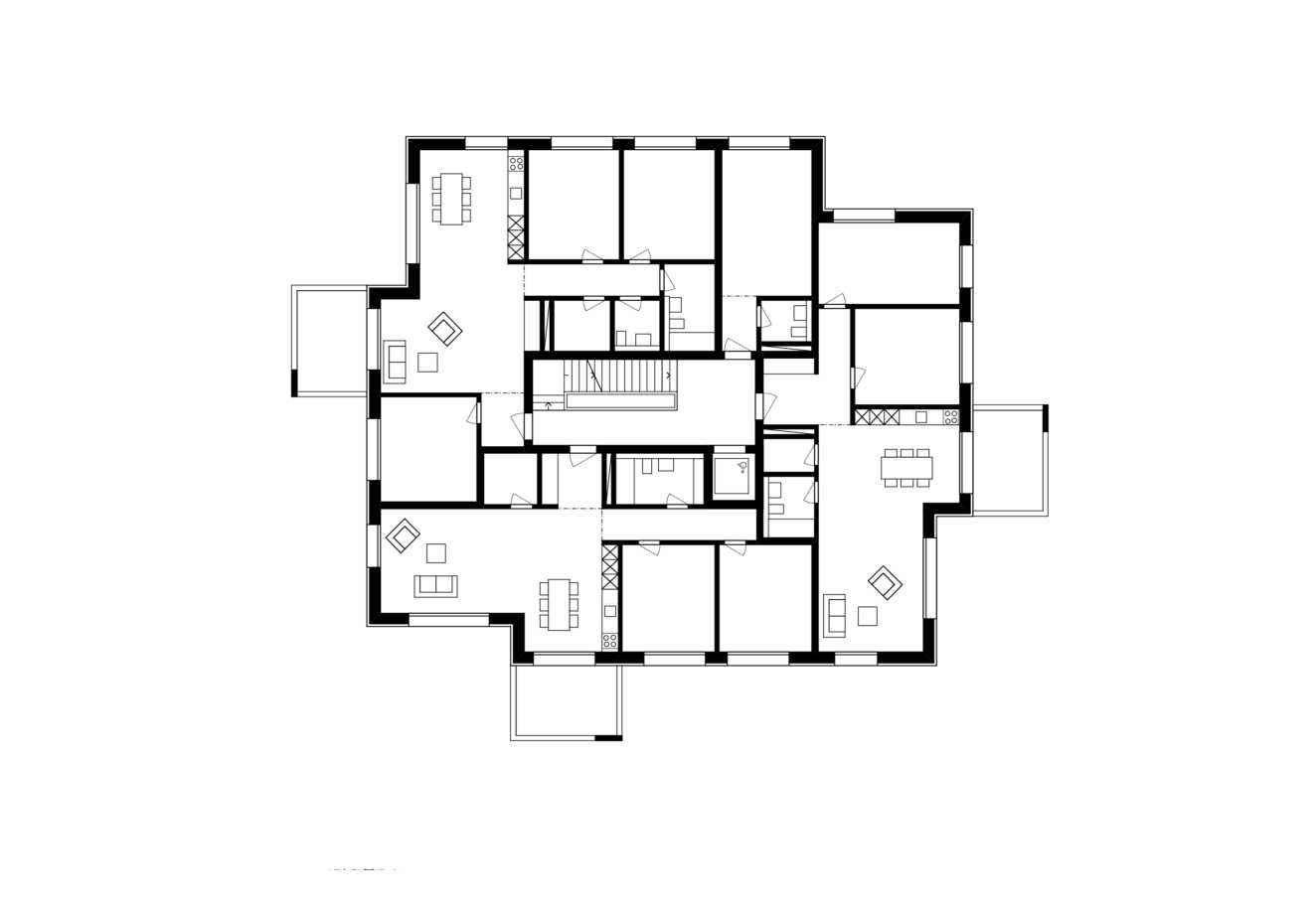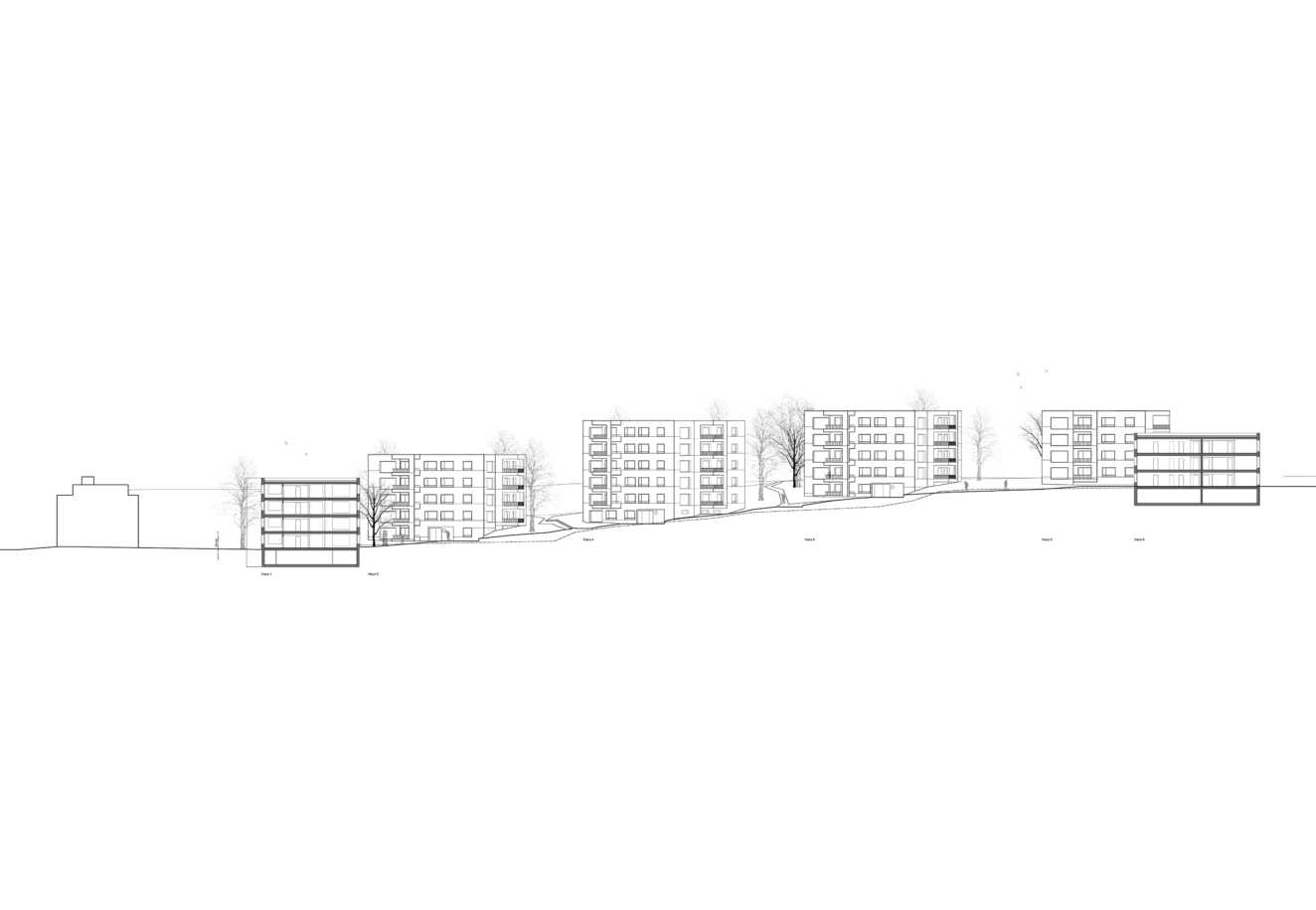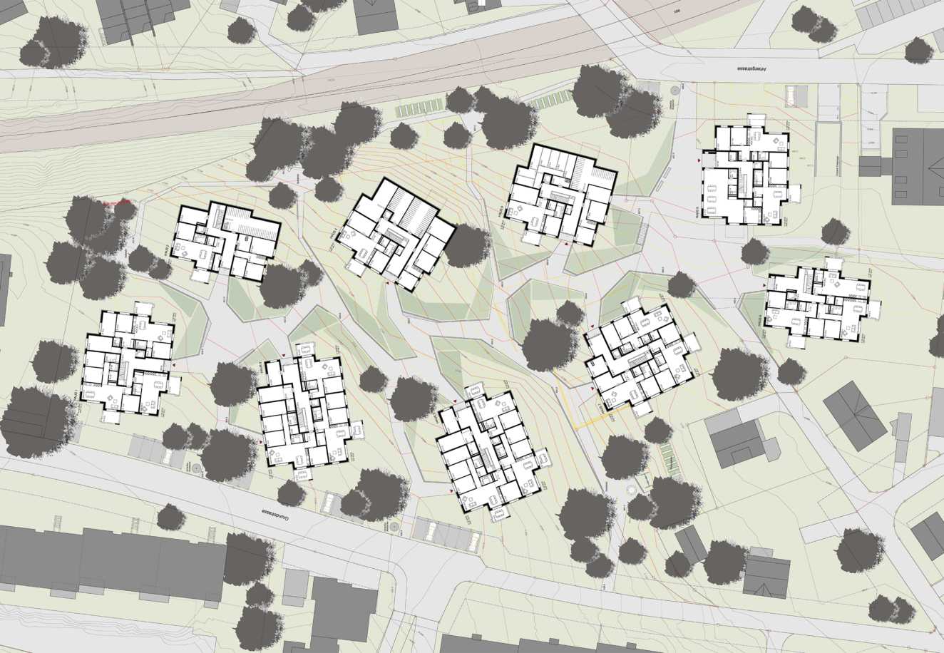 Neun Solitärbauten werden in die bewegte Topografie gestreut, die ein virtuelles Kraftfeld aufspannen und dabei von einer allseitigen guten Belichtung profitieren. Auf jedem Geschoss liegen drei individuelle Wohnungen und ein Schaltzimmer, das als Atelier, Gäste- oder Musikzimmer dienen kann. Ein zusätzlicher Gemeinschaftsraum ist von aussen separat zugänglich. Die zwei südlichsten Gebäude eignen sich dank der bequemen Erschliessung für ältere oder behinderte Menschen.