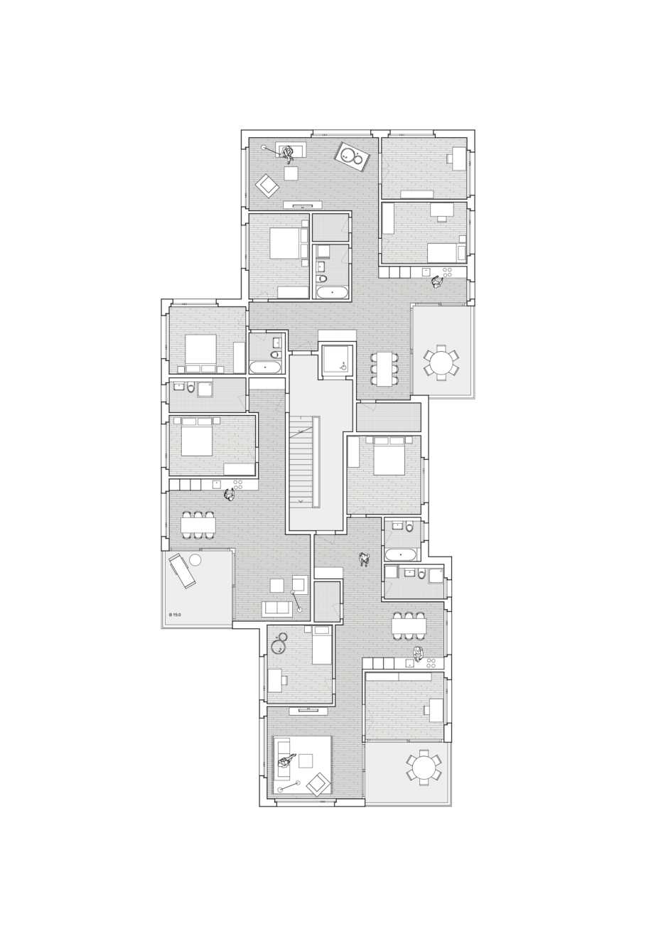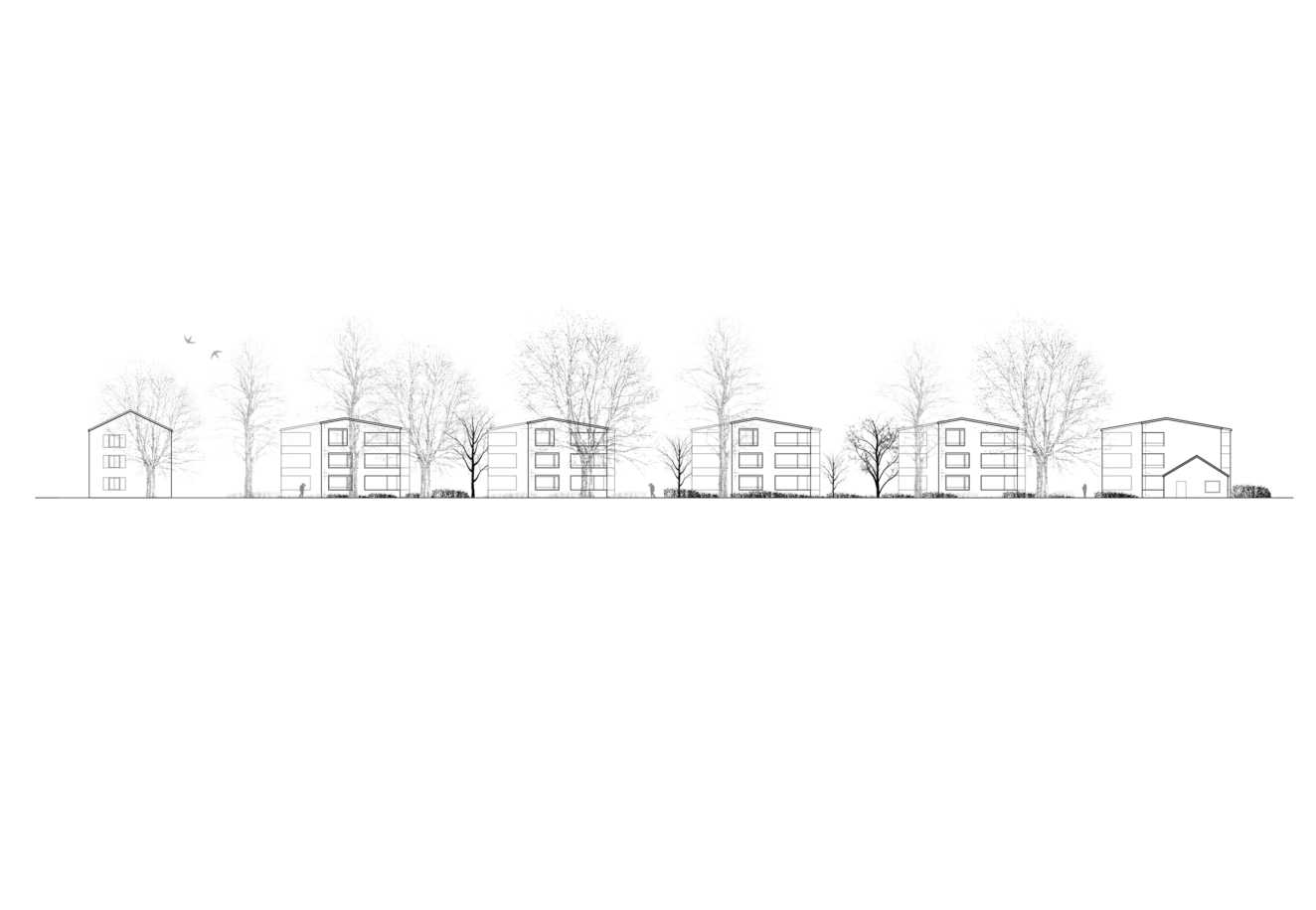 Mit den fünf Gebäudezeilen und den quartiertypischen Lochfassaden wird die Körnung der Siedlungsstruktur bewahrt. Der zurückhaltende beige Farbton bindet die neuen Häuser in den Bestand ein. Kräftig rote Stoffstoren setzen einen farblichen Kontrast – auch zum Grün der Umgebung. Alle Wohnungen haben mindestens eine dreiseitige Ausrichtung. Aufgrund ihrer Ost-West Orientierung verfügen Küche und Wohnzimmer ganztags über eine gute Besonnung. Die Übereck-Balkone sind dem Volumen eingeschrieben und orientieren sich zur imposanten Kulisse der Baumreihe.